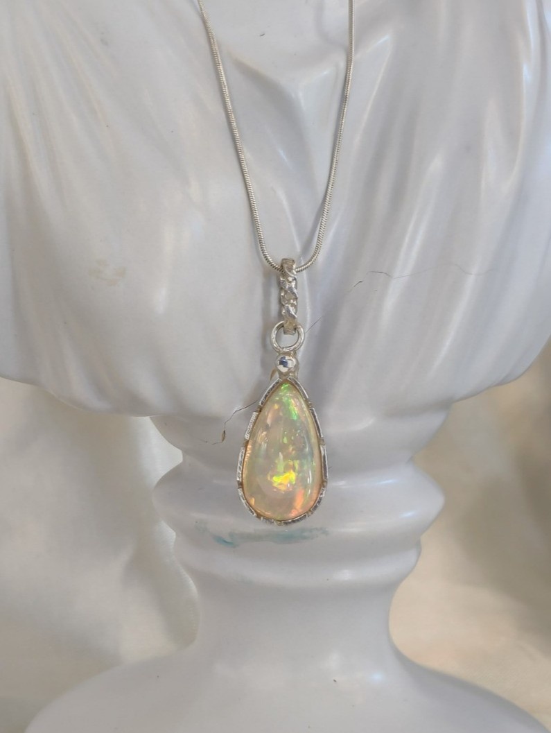 Safe Storage: Store flat in a soft, lined jewelry box or pouch to prevent the delicate chain from tangling and the opal from being scratched by harder stones.