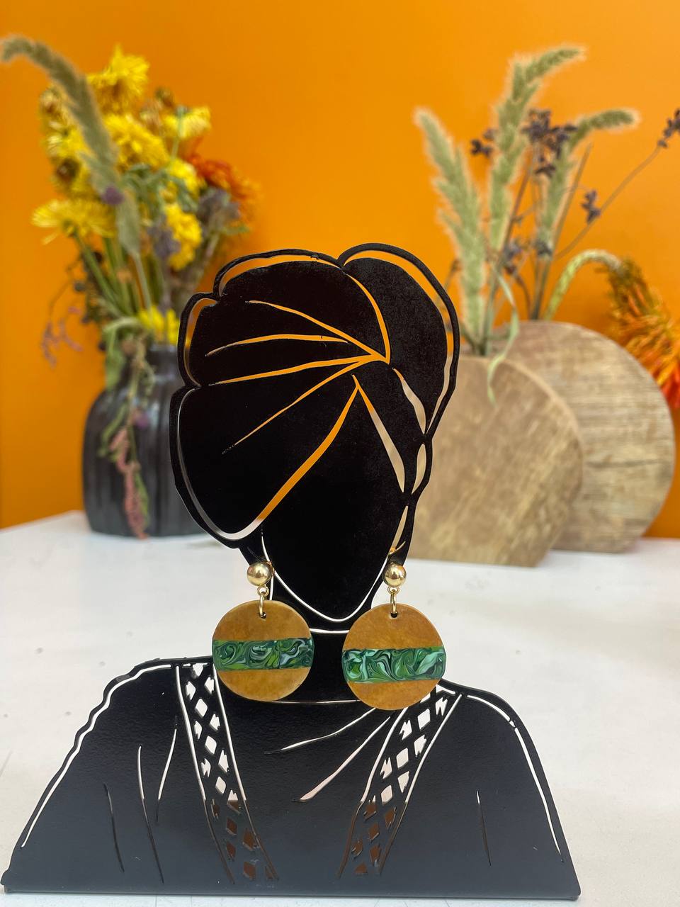 The Arenguade Earrings from the Enzirt Collection celebrate Ethiopian artistry through bold form and organic beauty. Hand-carved calabash paired with gleaming gold-plated studs and a vibrant green-marble swirl creates a striking statement that feels both earthy and modern.