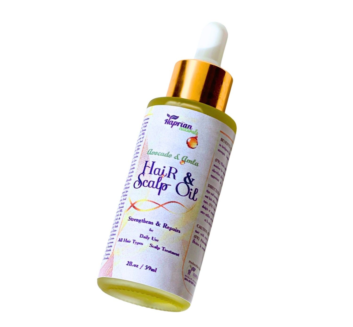 Avocado & Amla Hair & Scalp Oil by Haprian Naturals The secret to a healthy crown lies in the finish. Our Hair & Scalp Oil is the ultimate multi-tasker, combined to protect as well as it corrects.