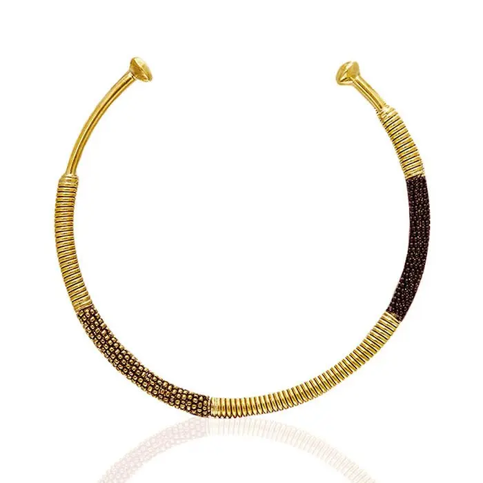 The Ayo Women's Necklace features a classic torque (open collar) silhouette, designed to sit gracefully around the neckline. A solid brass core provides structure, while sections of the collar are meticulously hand-wrapped to create contrast and visual depth.