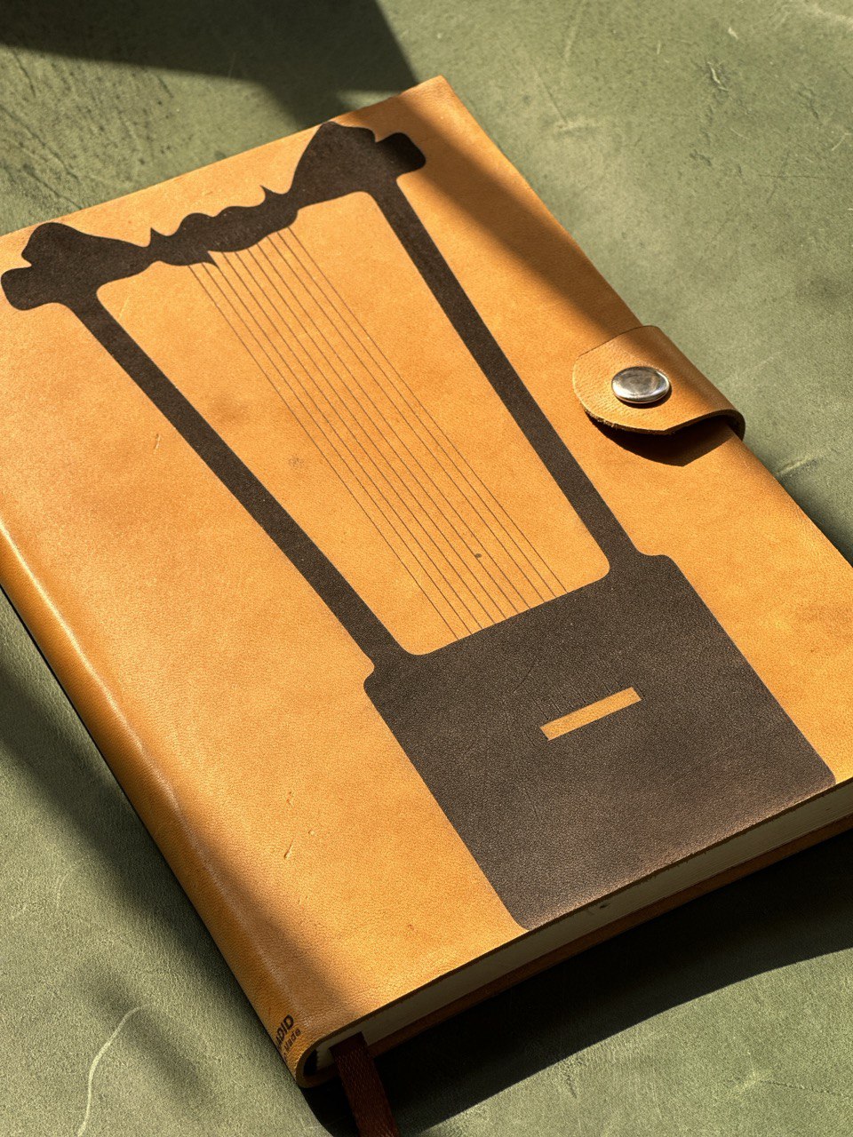 Handcrafted Ethiopian leather notebook featuring a bold Begena (traditional Ethiopian harp) illustration