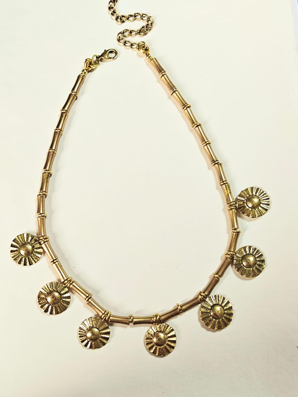 This piece is a testament to traditional brass casting techniques. The necklace body is formed by stringing polished, cylindrical brass tubes, creating a semi-rigid structure that lays beautifully flat against the chest. The seven focal pendants are cast with intricate detail, featuring a smooth domed center surrounded by textured, radiating petals or rays. The necklace is finished with a secure lobster clasp and an adjustable extender chain for a customized fit.