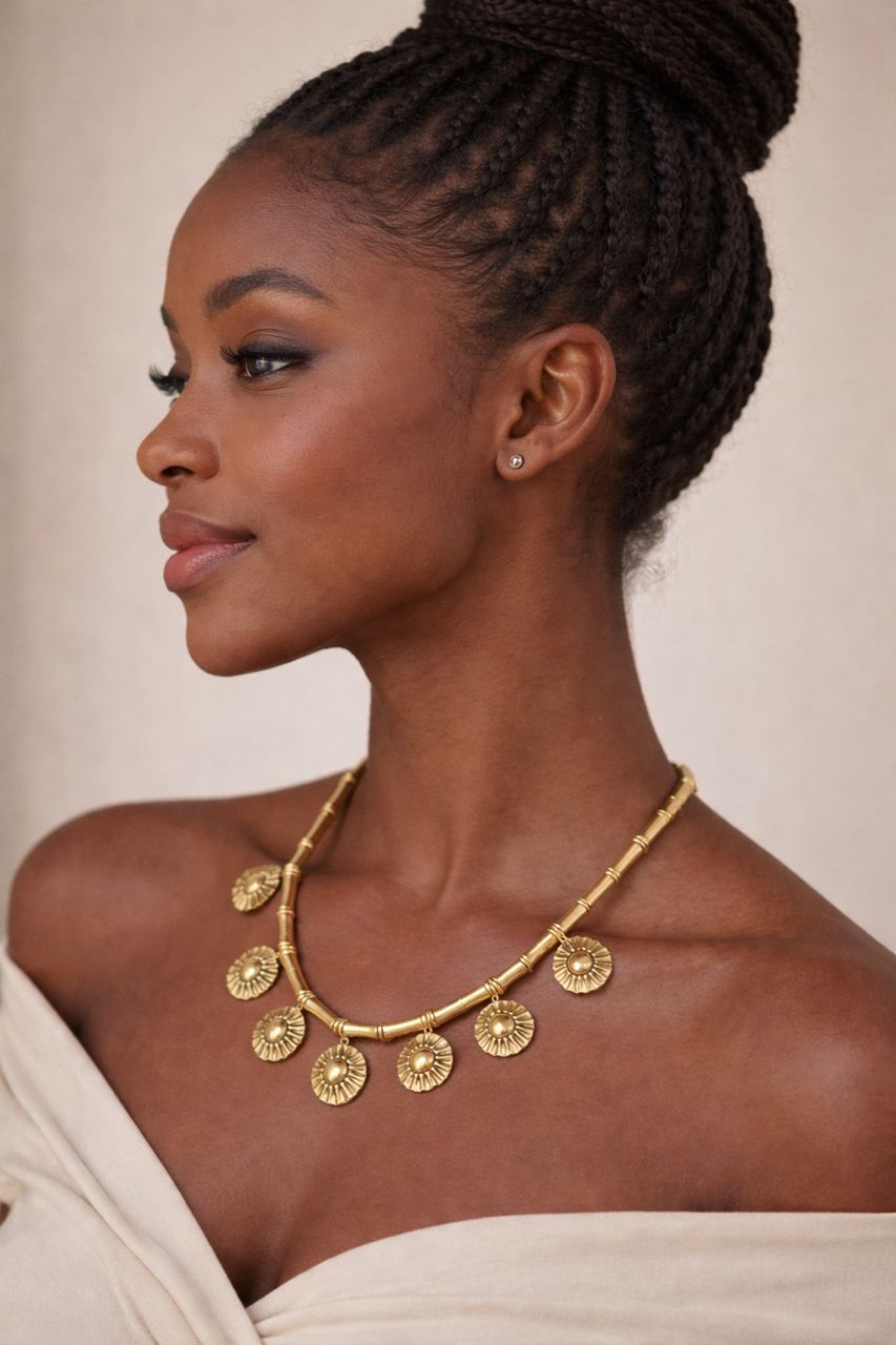 Capture the essence of the golden hour with this breathtaking collar piece. Inspired by the blooming flora and radiant sun of the African savannah, Tiger Tail Twister has crafted a necklace that feels both ancient and inherently modern. The seven cast brass pendants—each resembling a blooming flower or a brilliant sunburst—are spaced perfectly to rest elegantly along the collarbone. It is a celebration of bold femininity, designed for the woman who loves her jewelry to tell a story of artisan heritage and unapologetic style.