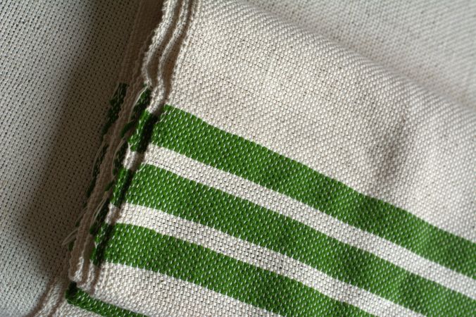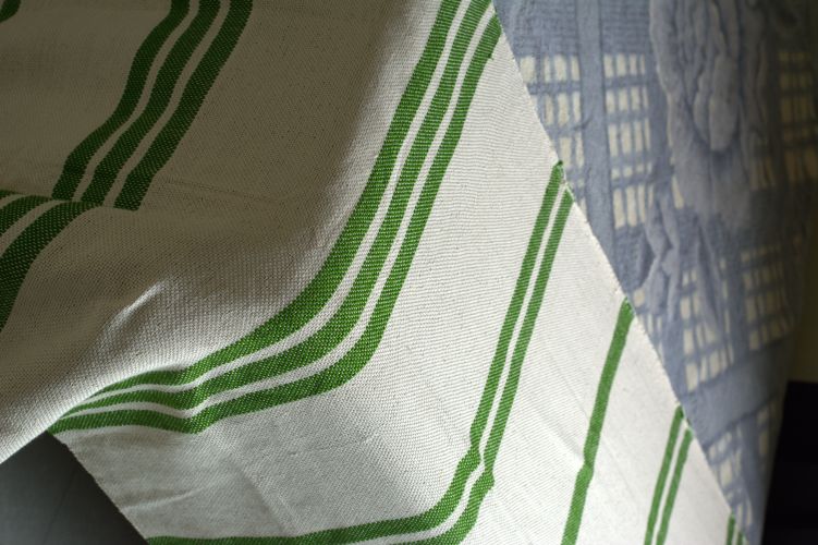 This piece is a testament to the art of traditional handweaving. Crafted in pure cotton, the textile carries a light yet grounded tactility. The soft contrast palette of ivory and green is visually striking yet calming. Because it is entirely handwoven, the surface remains breathable, with slight, beautiful irregularities that proudly display its artisanal origins. Finished with a hand-tied fringe, the edges soften the structured lines while maintaining perfect clarity.