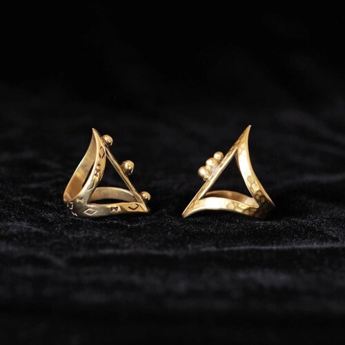 Each ring is shaped and finished entirely by hand using solid brass. The angular, corset-inspired silhouette is intentionally open, allowing flexibility while maintaining a strong sculptural presence. Hand-polishing enhances the golden surface, while subtle tool marks preserve the authenticity of artisanal work.