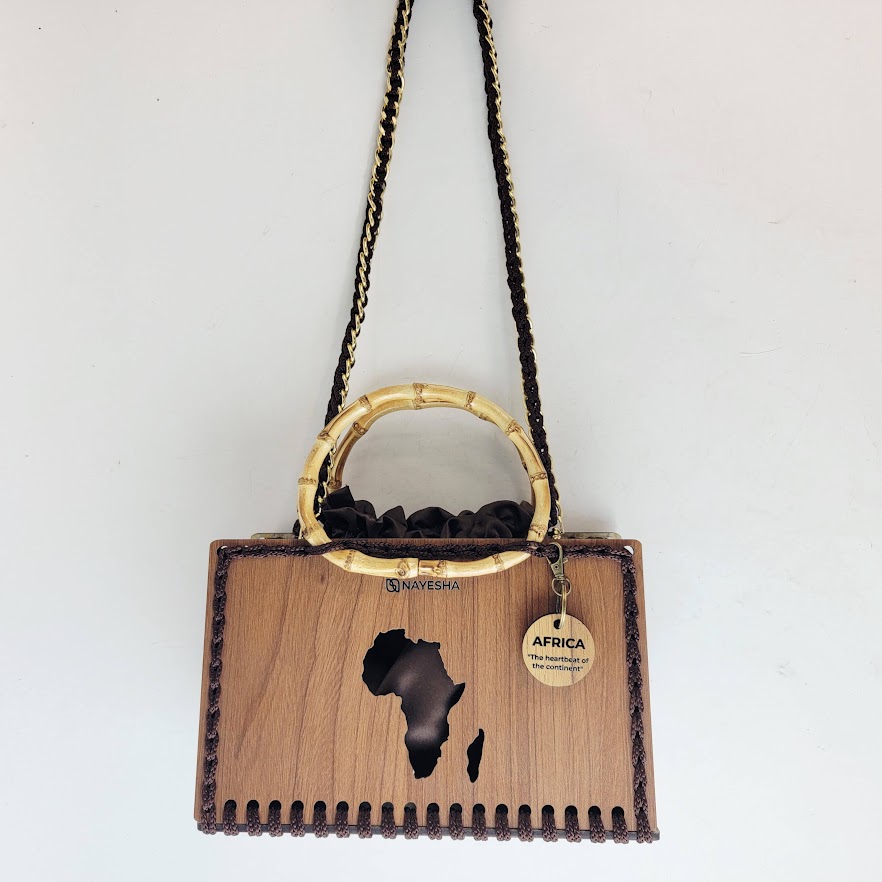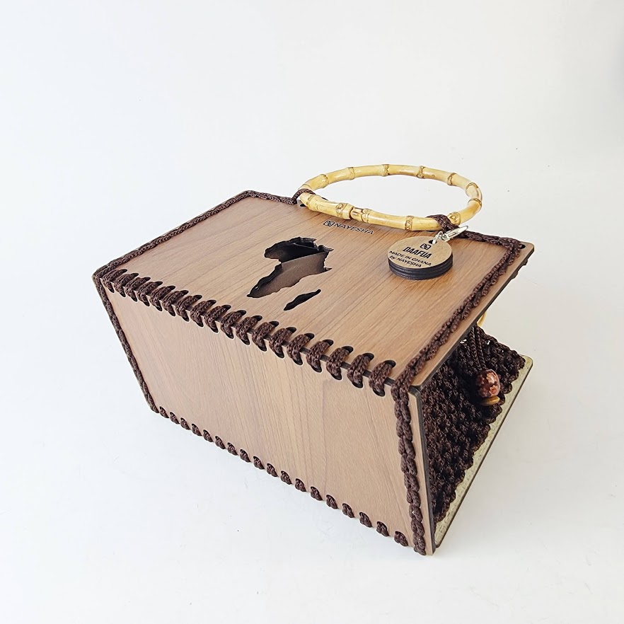This bag showcases the precision of Ghanaian artisans through its unique laser-cut wooden plate and intertwined crochet-with-chain handle. The intricate patterns on the wood provide a structured contrast to the soft, durable crochet fibers. Designed with a medium silhouette it is perfectly sized for your essentials, allowing you to step out with confidence and charm.