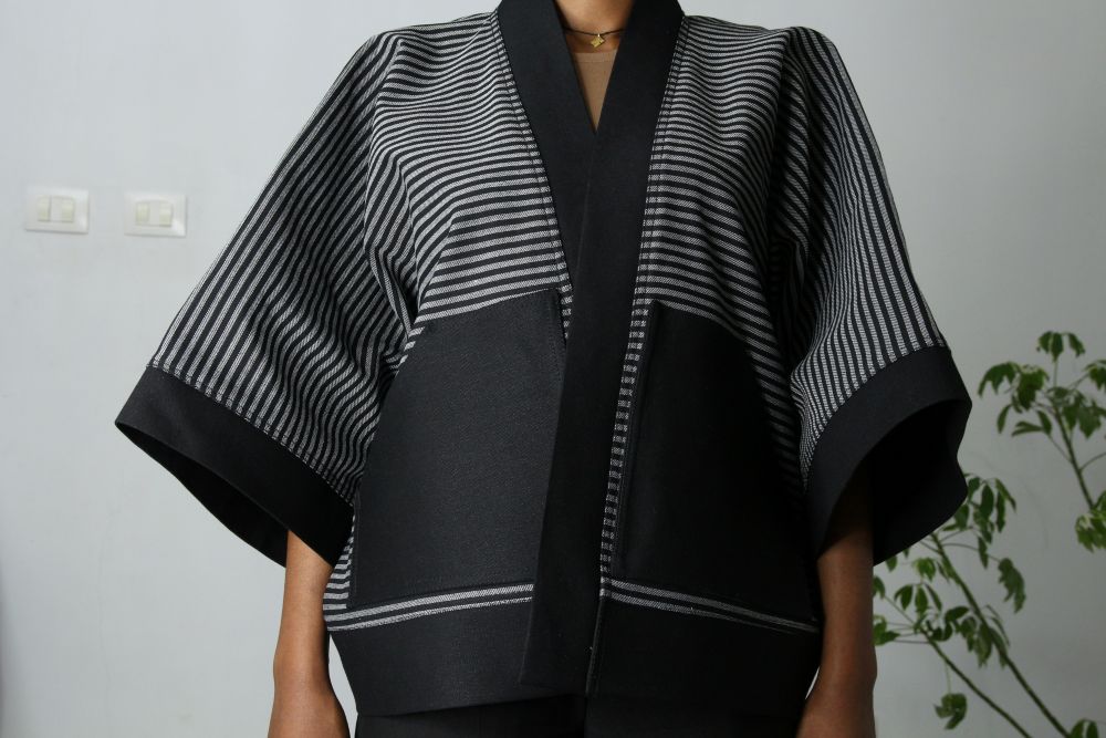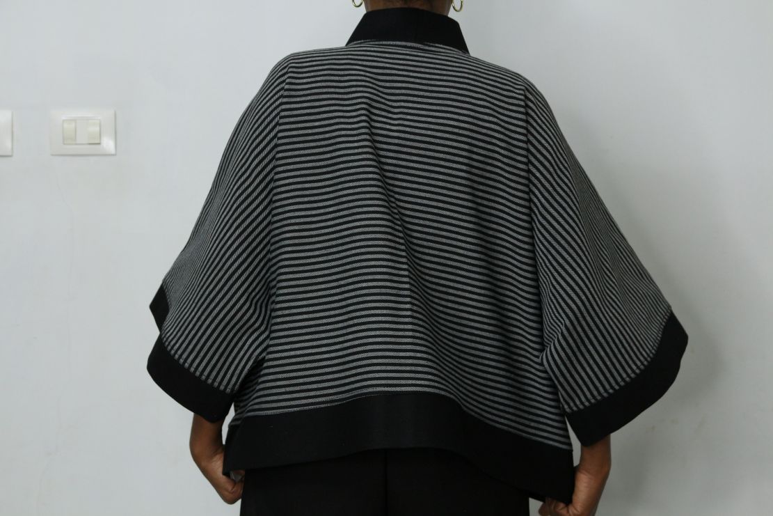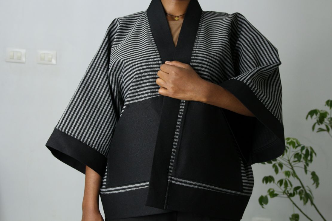 Shop: SARAH™Ethiopian Denim Fashion | Sarah Long Kimono Coat | Artisanal Bleached Denim | Unique Statement Kimono Coat | Black Accent Denim | Unique Stripe Pattern Denim Jacket