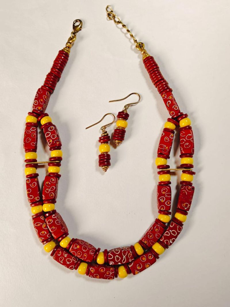 Make a vibrant cultural statement with this stunning double-strand necklace and earring set, featuring authentic West African recycled glass beads hand-painted in rich red and bright yellow.