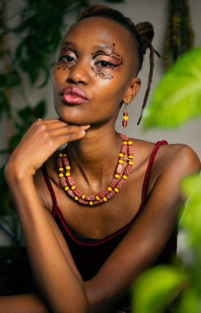 This necklace is a celebration of West African bead-making heritage. The vibrant red and yellow palette captures the heat of the African sun and the rich earth of the continent. The true magic lies in the details: each of the large red cylindrical beads is made from recycled glass, fired in earthen kilns, and then individually hand-painted with delicate white patterns. This ensures that no two beads—and no two necklaces—are exactly alike. Tiger Tail Twister has elevated these traditional beads into a contemporary double-strand design, creating a piece that honors the past while demanding attention in the modern world.