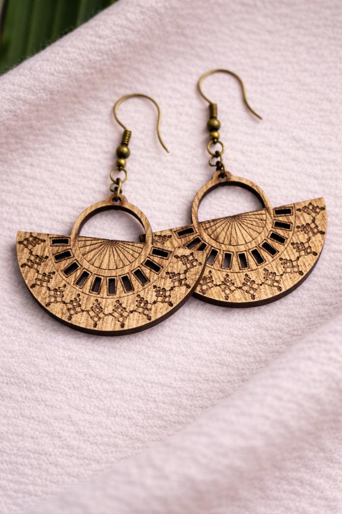 By transforming the classic fan silhouette into a contemporary wood art piece, these earrings offer a unique balance of tradition and high-fashion urban style.