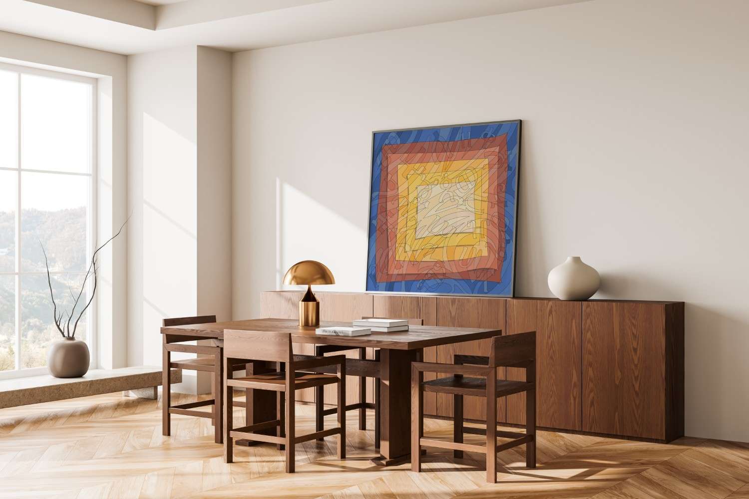 Modern Geometric Harmony: Features vibrant interlocking blocks of yellow, warm terracotta, and deep blue for a sophisticated contemporary look.