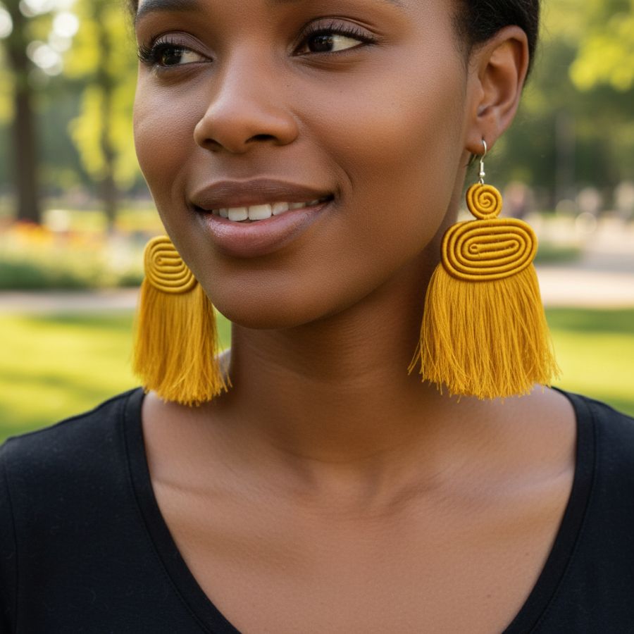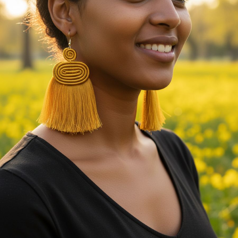 Radiate warmth with the Imizi Golden Tassel Earrings. Handcrafted with silky yellow thread and flowing fringe. Lightweight, bold, and perfect for sunny days.