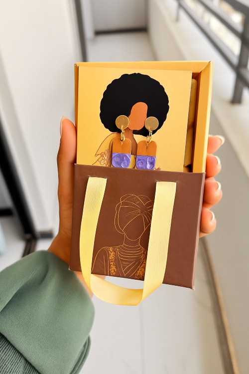 The Hamrawi Earrings from the Enzirt Collection are hand-crafted from authentic Ethiopian calabash and brought to life with expressive purple-marble swirls painted freely by hand. Bold yet balanced, each pair reflects individuality, cultural artistry, and modern elegance.
