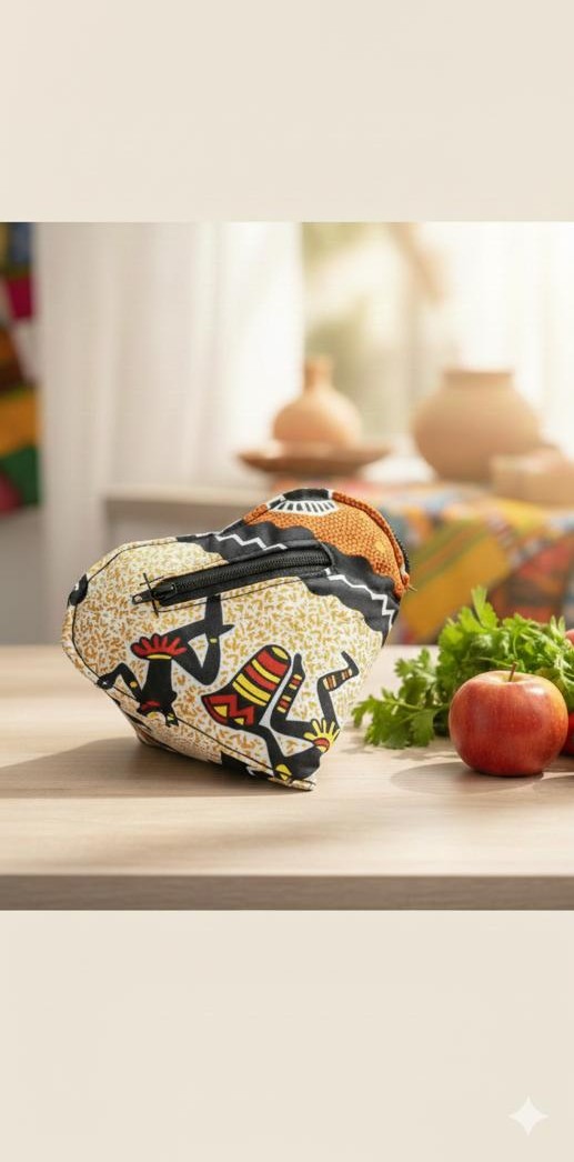 Expertly sewn from durable African wax print fabric, this bag is engineered for real life. The material is chosen for its ability to withstand the weight of groceries while remaining lightweight enough to fold down flat. The stitching is reinforced at stress points, and the transition from the heart-shaped pouch to the full tote is seamless, showcasing the artisan's clever pattern engineering.