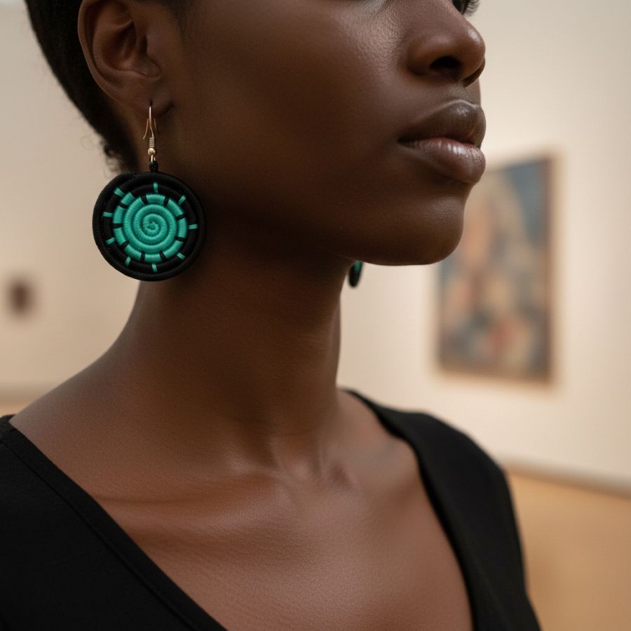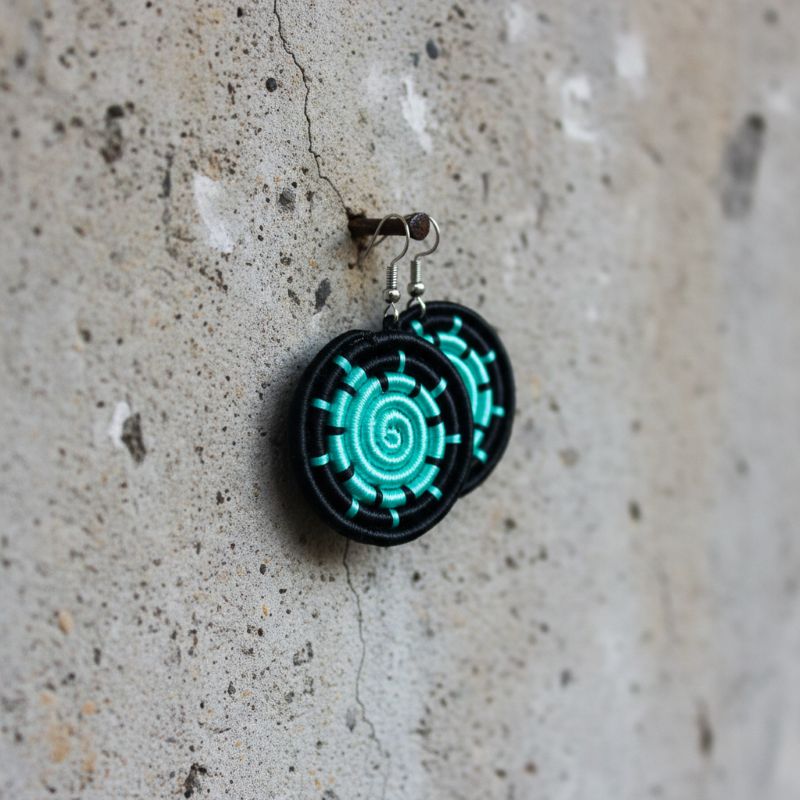 Shop: IMIZI CraftsImizi Spiral Disc Earrings | Handwoven Turquoise Thread | Boho Statement Jewelry | Lightweight Artisan Drops | Ethnic Black & Blue