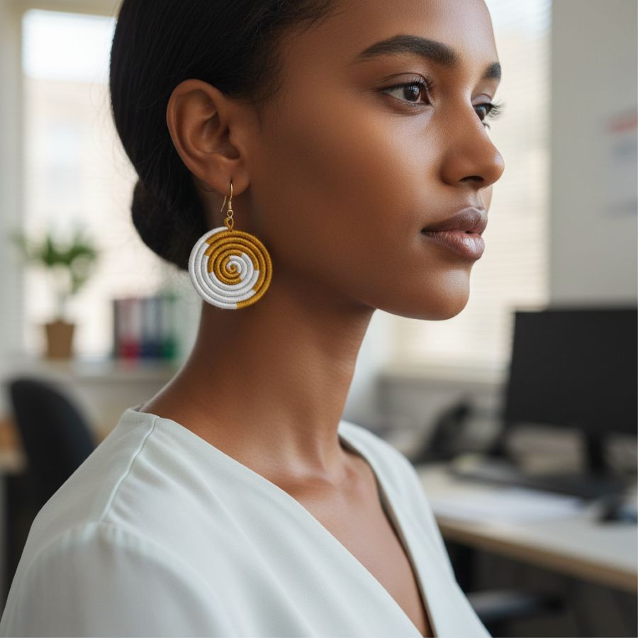 Add a splash of artisan color to your jewelry rotation. These earrings are a celebration of traditional winding techniques applied to modern geometry. The spiral motif is a universal symbol of growth and evolution, captured here in a vibrant turquoise hue that evokes the energy of tropical waters. Imizi Crafts designed these for the woman who loves bold accessories but refuses to compromise on comfort. They are "visual volume" without the physical weight—perfect for long days that turn into fun nights.