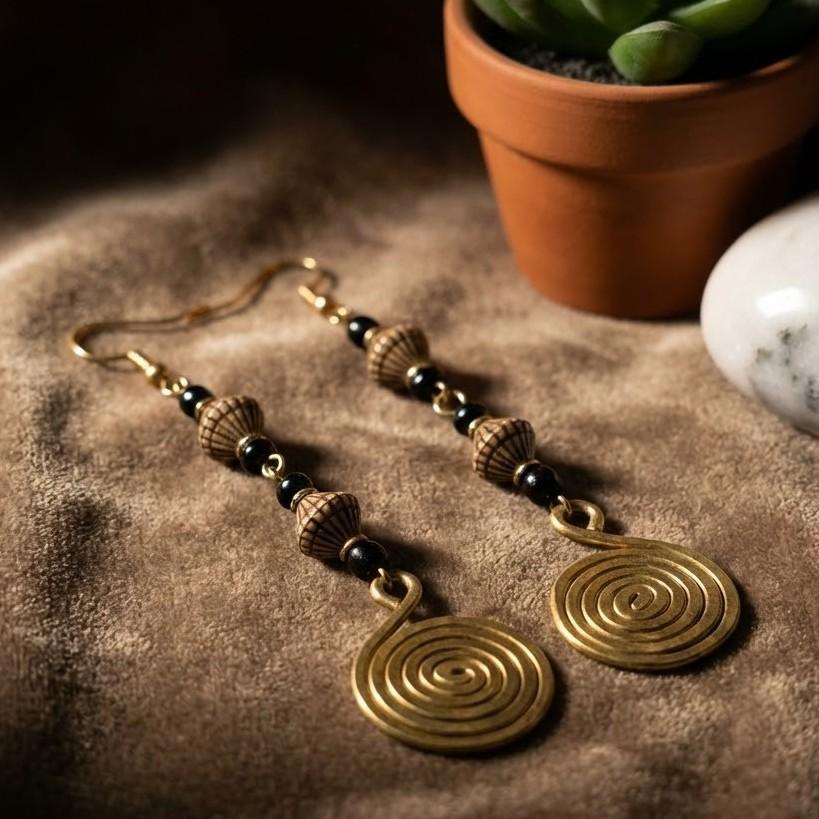 Artisanal Brass Spirals: Each earring is anchored by a large, hand-hammered brass spiral disc, representing the continuous flow of life and ancestral heritage.