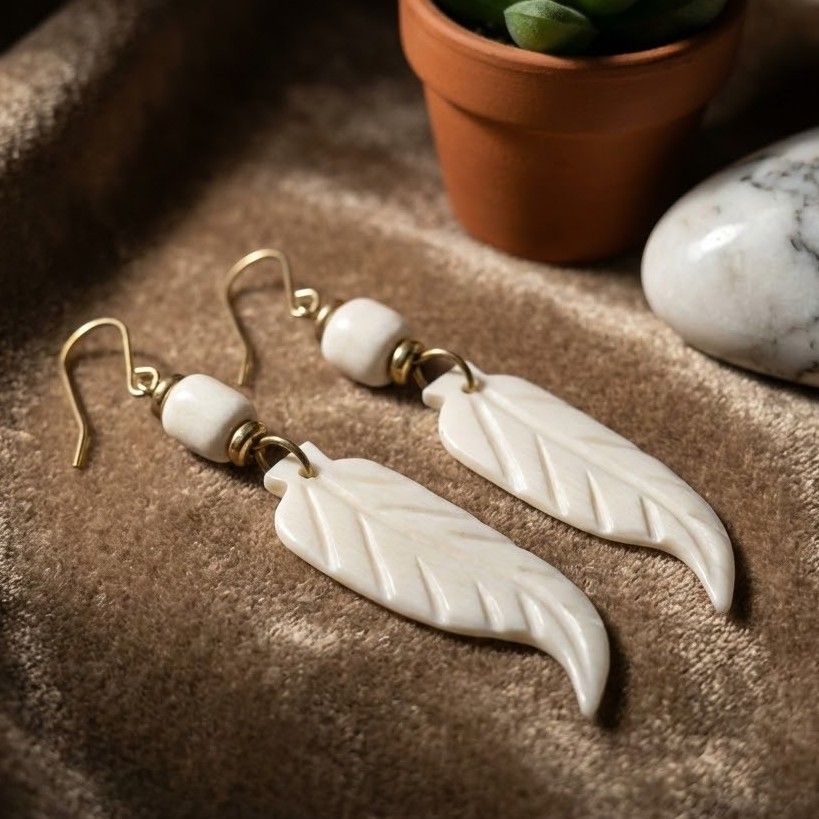 This artistic journey begins with the careful shaping of the bone, followed by meticulous hand-tooling to create the textured "veins" of the leaf, ensuring that no two pairs are identical.