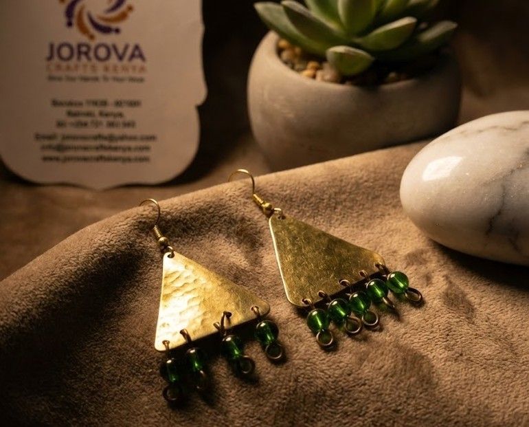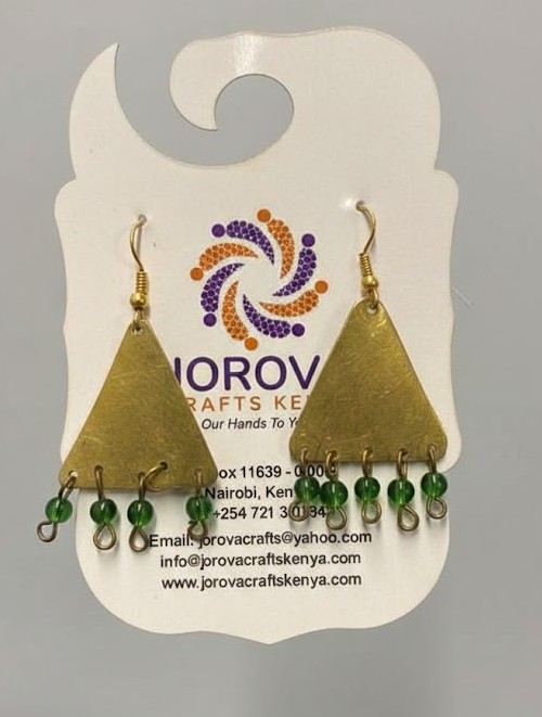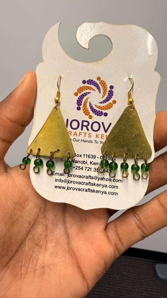 Shop: Jorova Crafts KenyaJorova Tribal Brass Earrings | Hammered Triangular Drop with Green Beads | Handcrafted Kenyan Jewelry | Ethical Brass Accessories | Nairobi Artisan Fashion