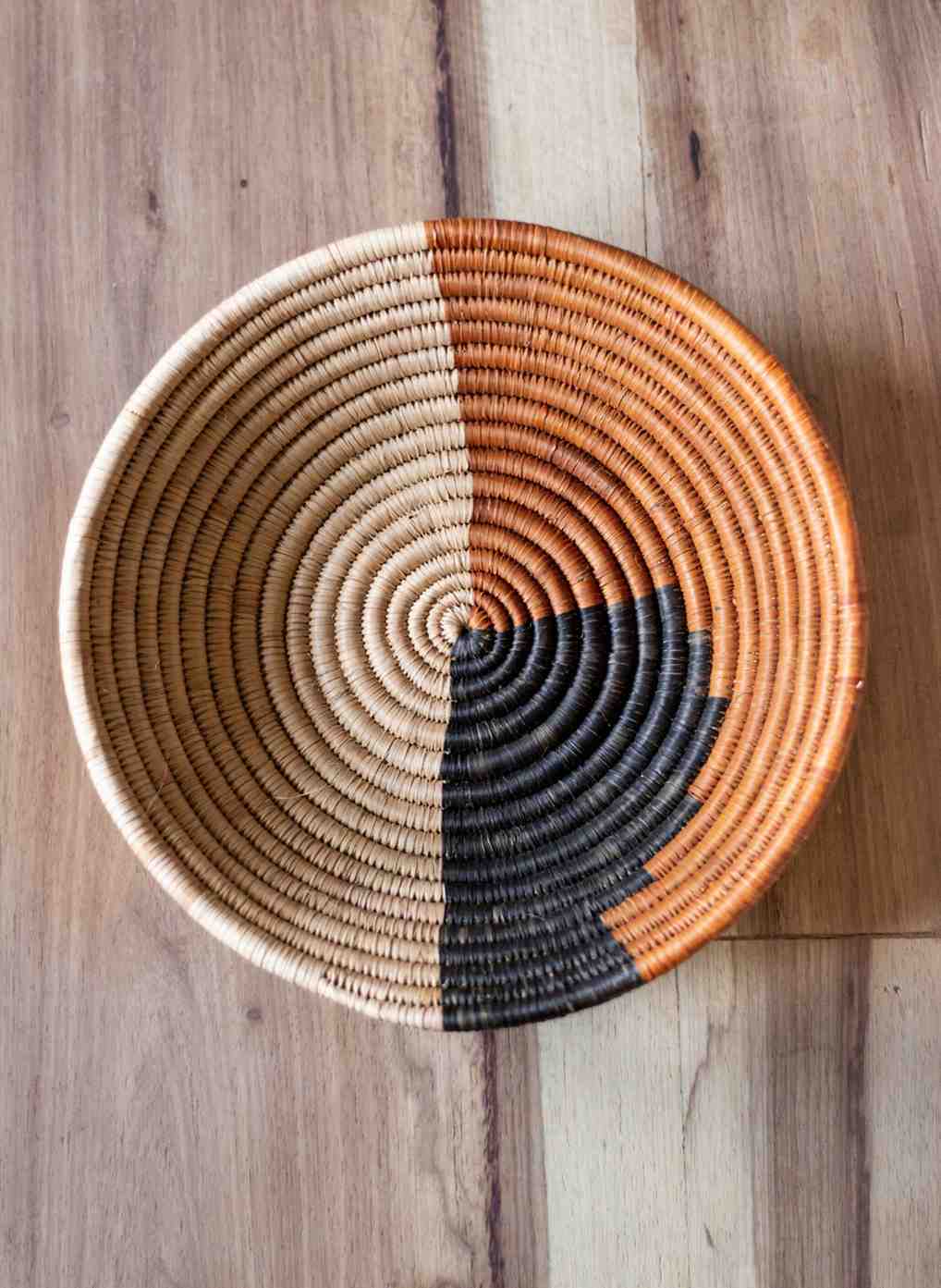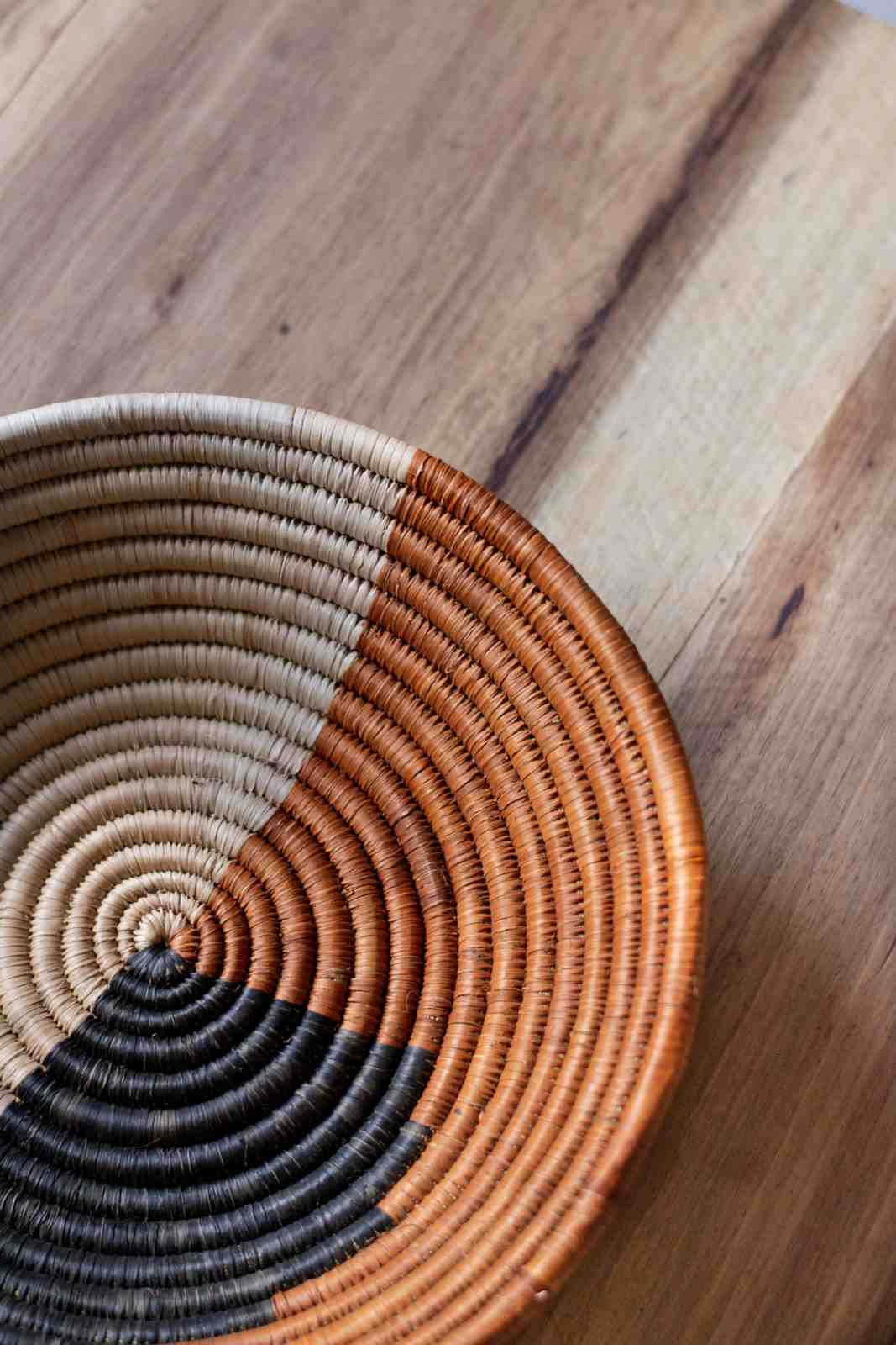 A premium 3-piece basket set crafted from rare Ntonzi root — dense, tightly coiled, beautifully weighty, and hand-woven into a striking three-tone palette for timeless, textural styling.