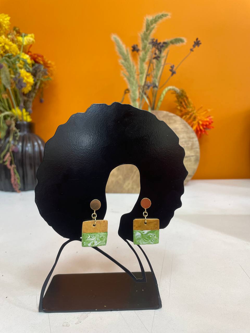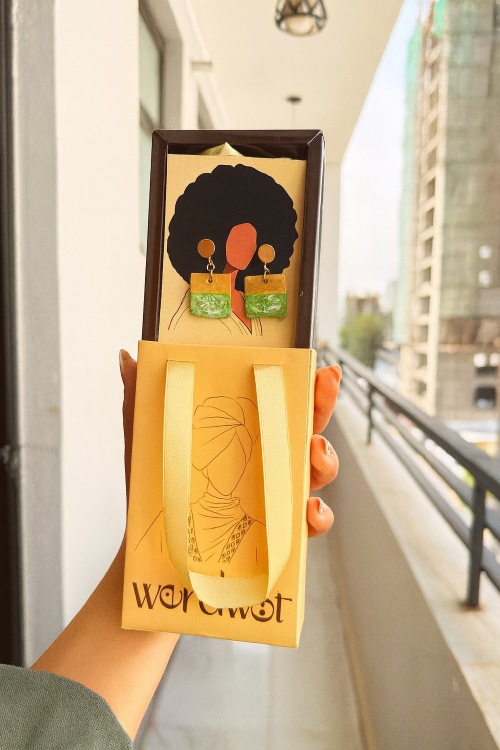 The Lomi Earrings from the Enzirt Collection transform organic Ethiopian calabash into modern wearable art. Each pair is carved and painted by hand, featuring lively lemon-green marbling that brings fresh energy and individuality to every piece.