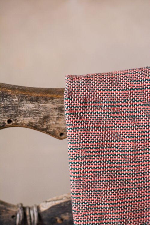 Introduce warmth, rhythm, and quiet energy to your space with the 'LUKA' Woven Grid Throw. Handwoven in a dense, pixelated grid of coral and deep green threads, this compact architectural textile delivers a unified plane of color and highly tactile structure.