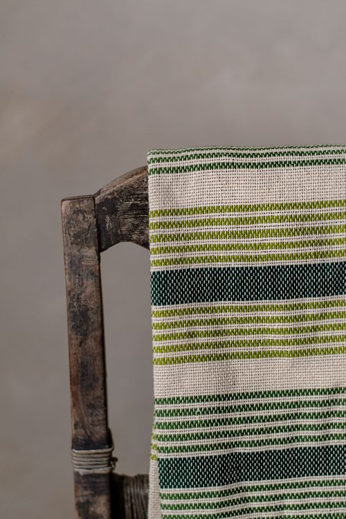 A composition of lines. A discipline of form. The 'LUNDA' Throw is defined by its vertical rhythm, using deliberate stripes to form a quiet system of order, repetition, and balance. The tonal greens move between depth and lightness, echoing layered vegetation, while the ivory bands introduce moments of stillness within the composition. This interplay creates an architectural textile that feels both directional and calm.
