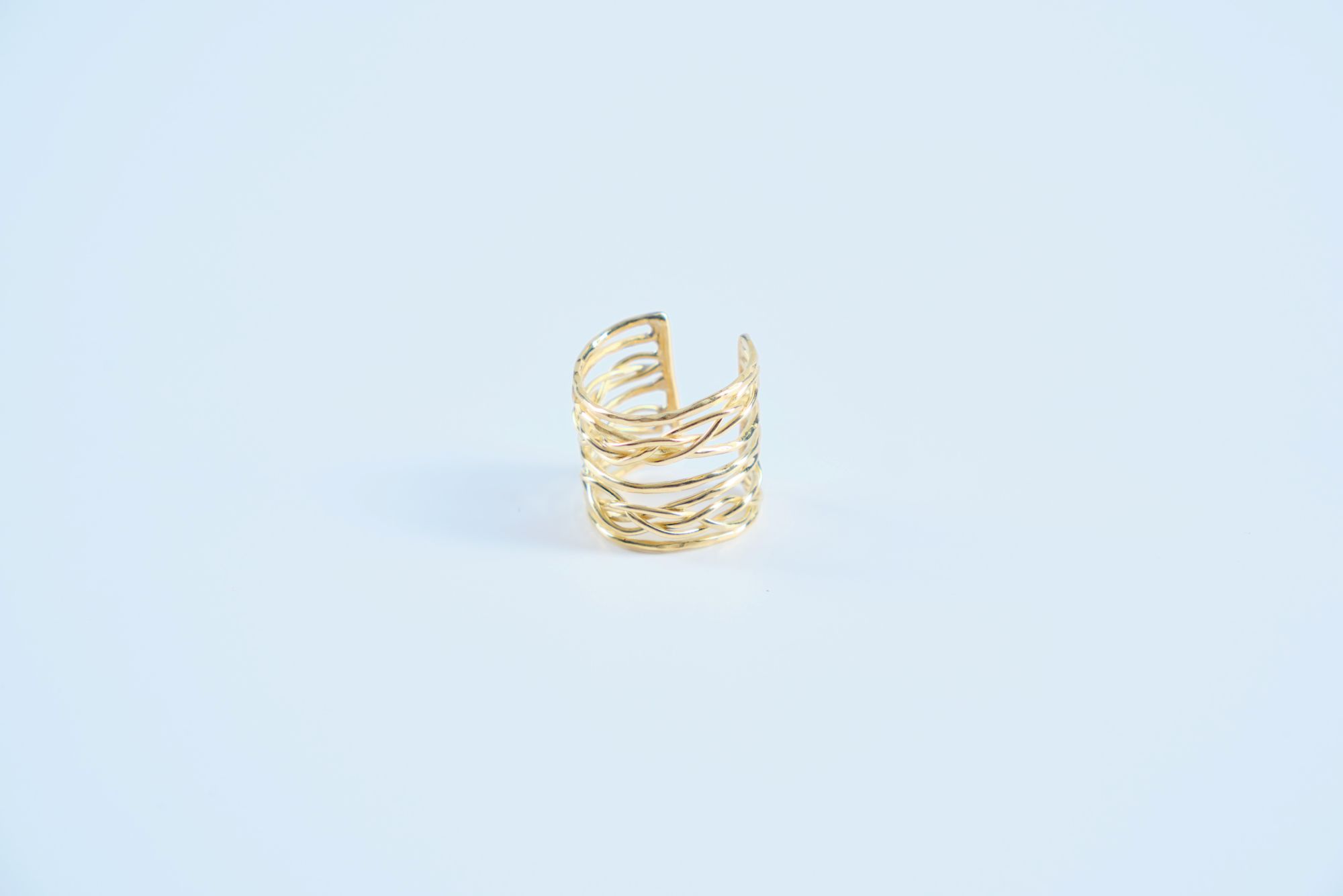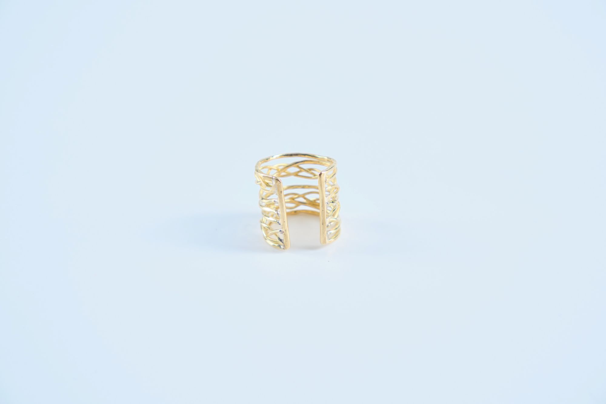The Mkeka ring is a masterclass in brass wire wrapping and soldering. The artisan shapes multiple thin brass wires, carefully overlapping and intertwining them at the front to create the central "woven" focal point. The wires are fused securely along the sides to maintain the ring's wide, stacked structure. The back of the ring is left cleanly cut and open, not only making it adjustable but also ensuring it is comfortable to wear without pinching.