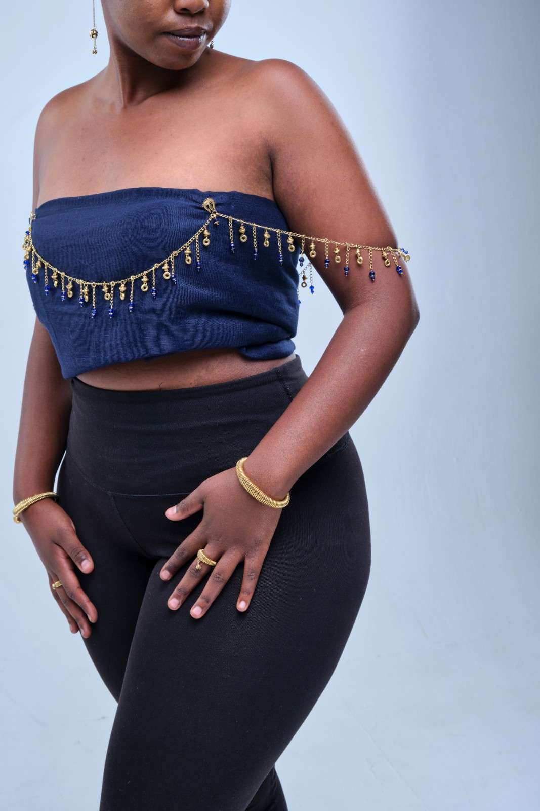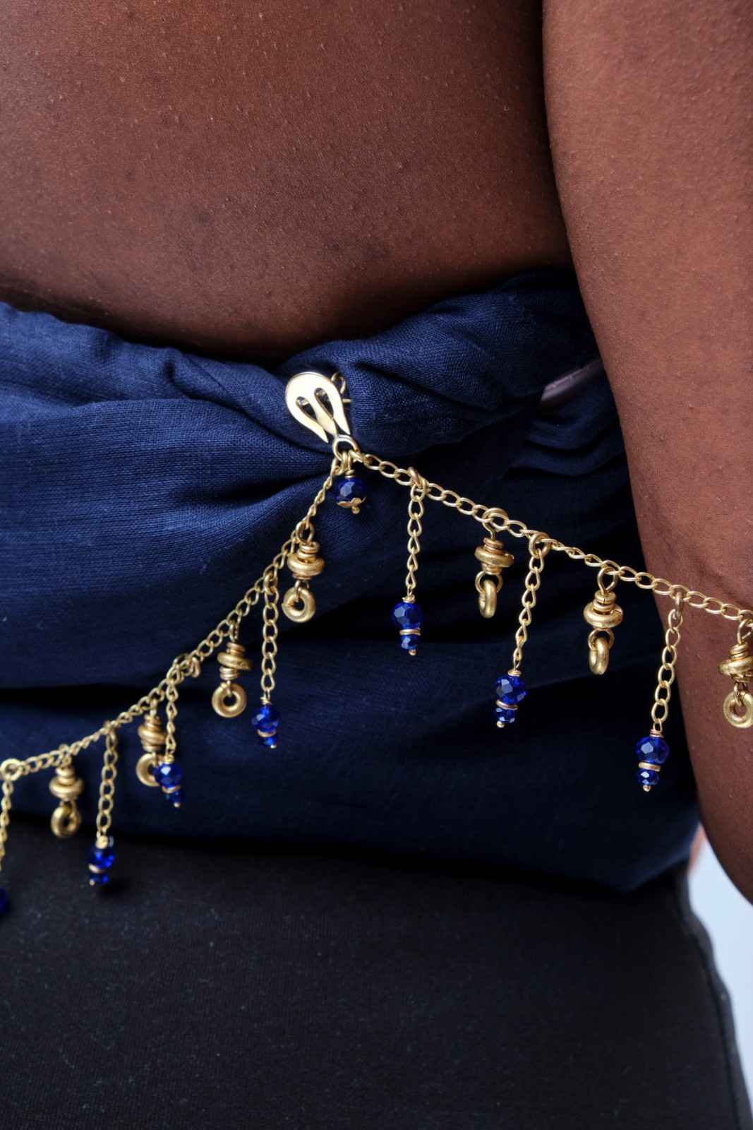 Transform your outfit with this striking, handcrafted blue glass bead and brass shoulder chain, designed to drape beautifully and command attention.