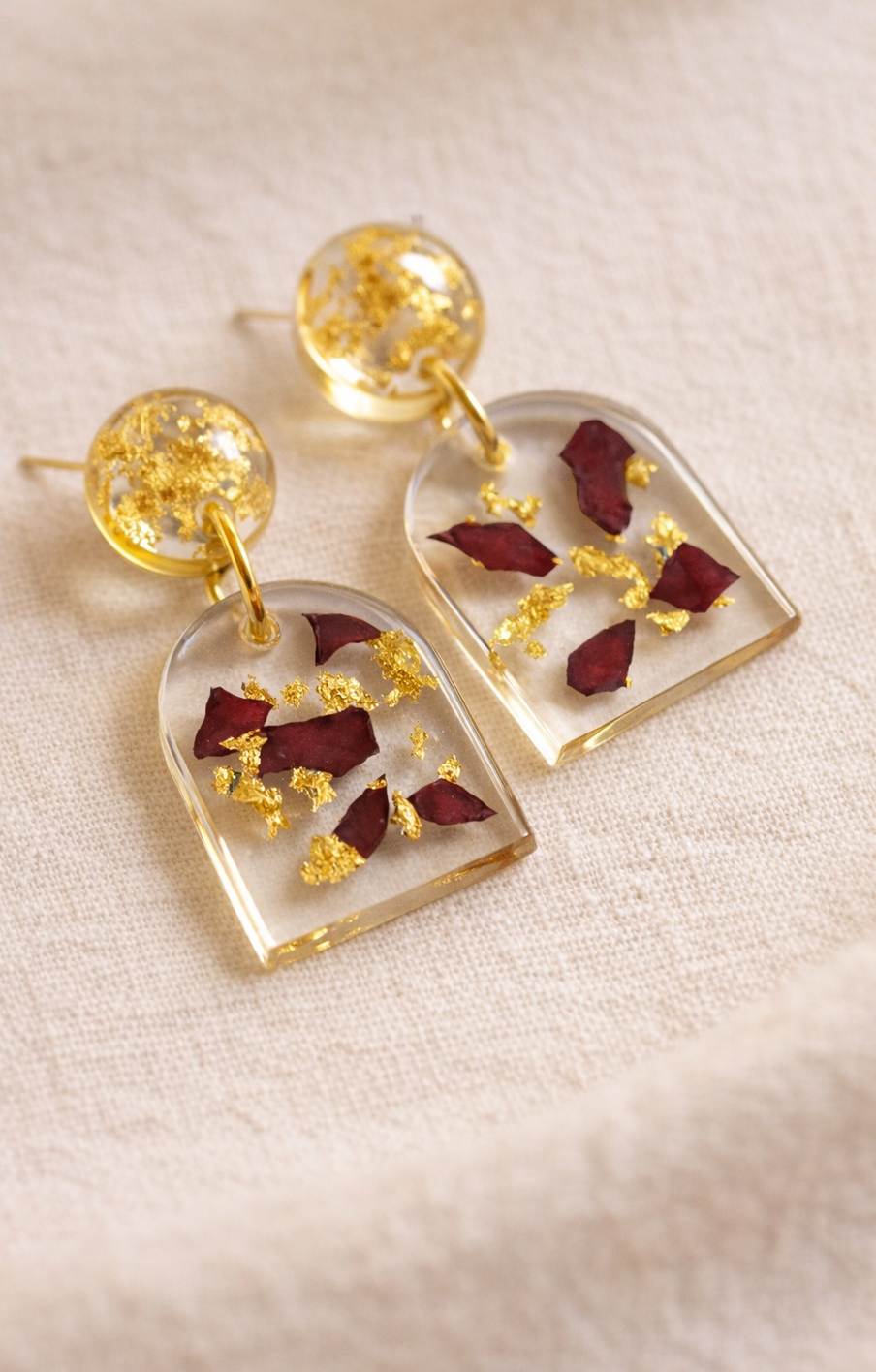 Shop: Maki Resin JewelryCrimson Petal & Gold Flake Resin Arch Earrings | Real Dried Flower Jewelry | Maki Resin Jewelry | Modern Botanical Statement | Gold Leaf Dangles | Afrikart