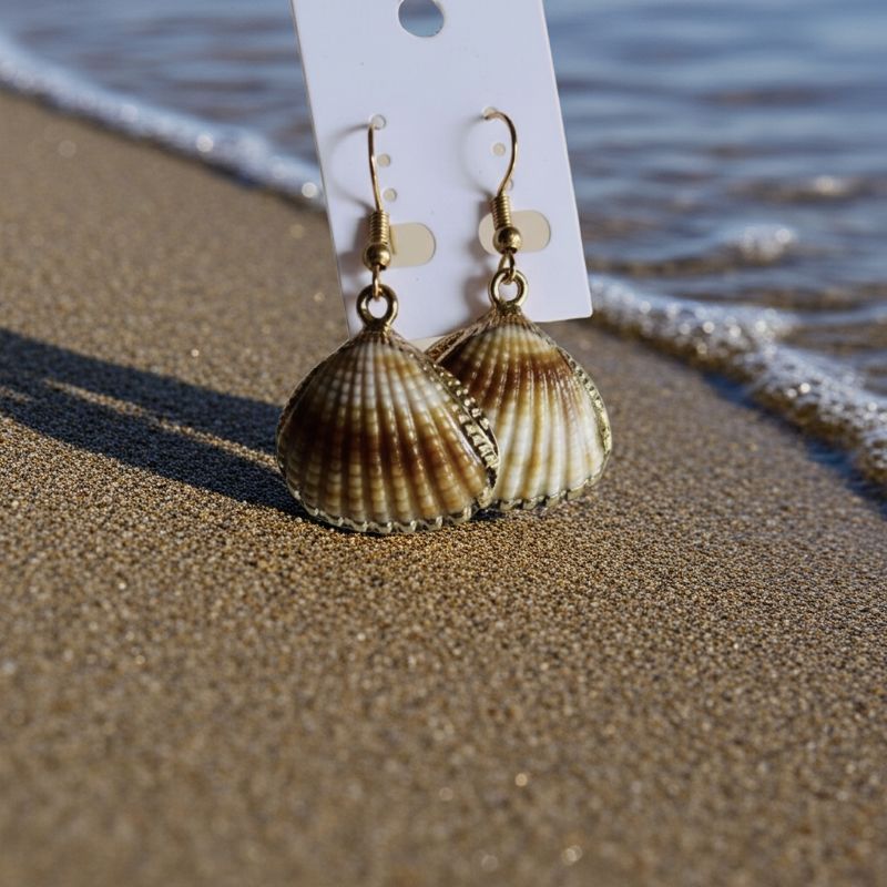 Shop: IMIZI CraftsImizi Gold Edged Seashell Earrings | Natural Scallop Dangles | Nautical Charm Jewelry | Coastal Beach Accessories | Brown & Gold Drop