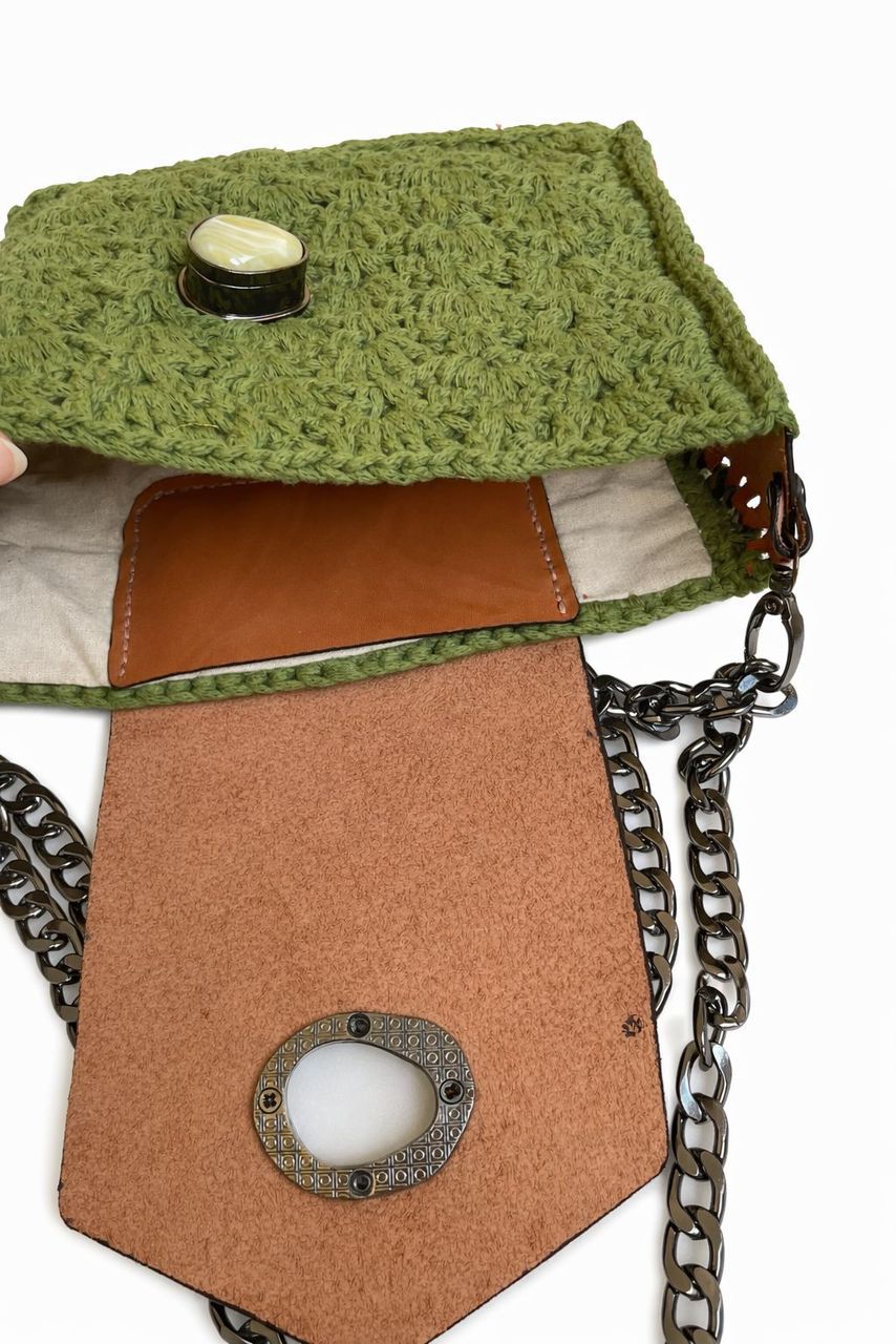 Olive Green Crochet Shoulder Bag with Macramé Cotton and Leather Details