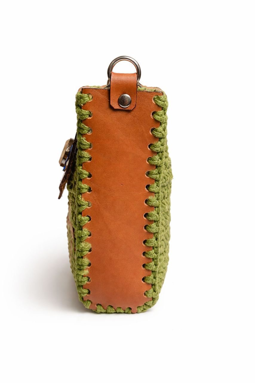 Elevate your evening or daily wardrobe with this elegantly handcrafted olive green macramé shoulder bag. It pairs durable cowhide leather with an intricate crochet design, providing a secure and stylish carrying solution for modern women.