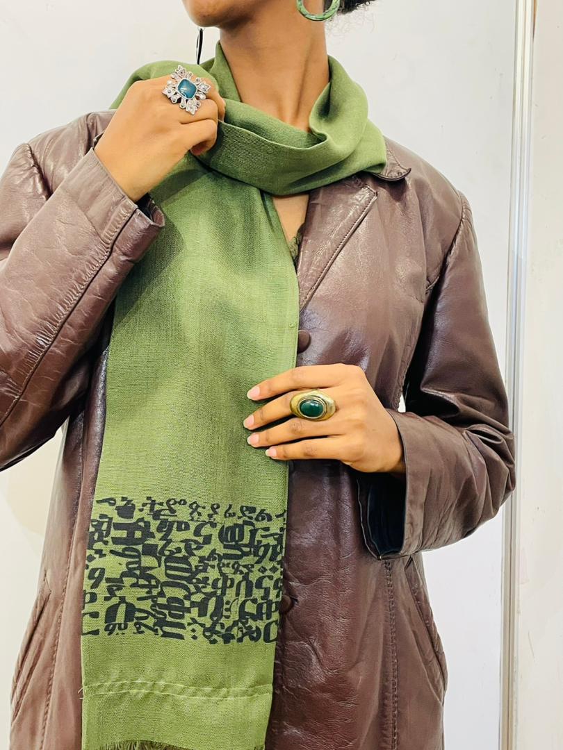 The Olive Green Scarf ( SIS ) is a celebration of language and landscape. The muted green hue reflects the natural beauty of the Ethiopian highlands, providing a calm, neutral base. The black Ge'ez calligraphy printed at the hem adds an intellectual and artistic edge, honoring one of the world's oldest written languages. Whether you drape it over a leather jacket (as pictured) or tie it in your hair, it bridges the gap between traditional storytelling and contemporary style.