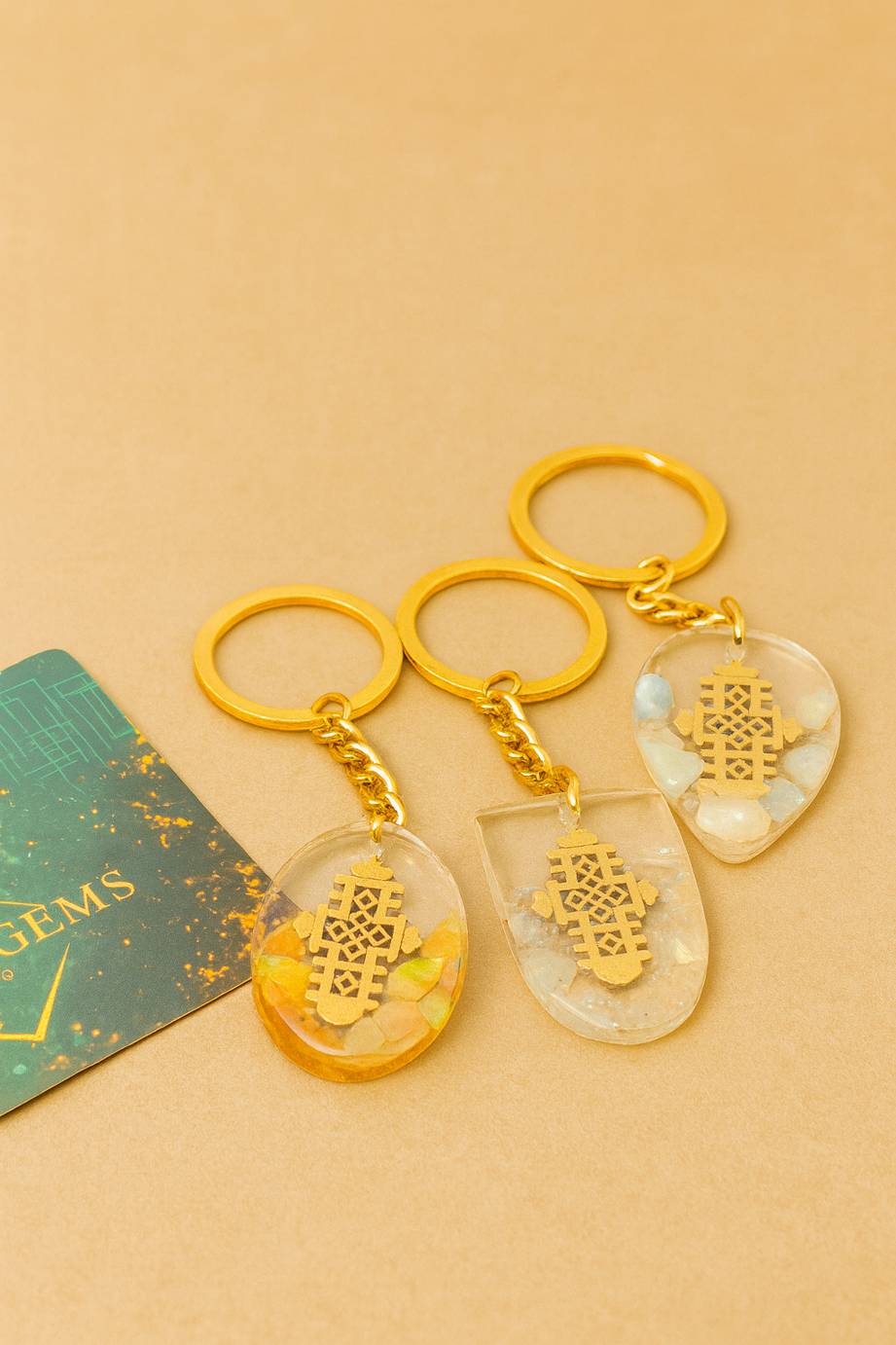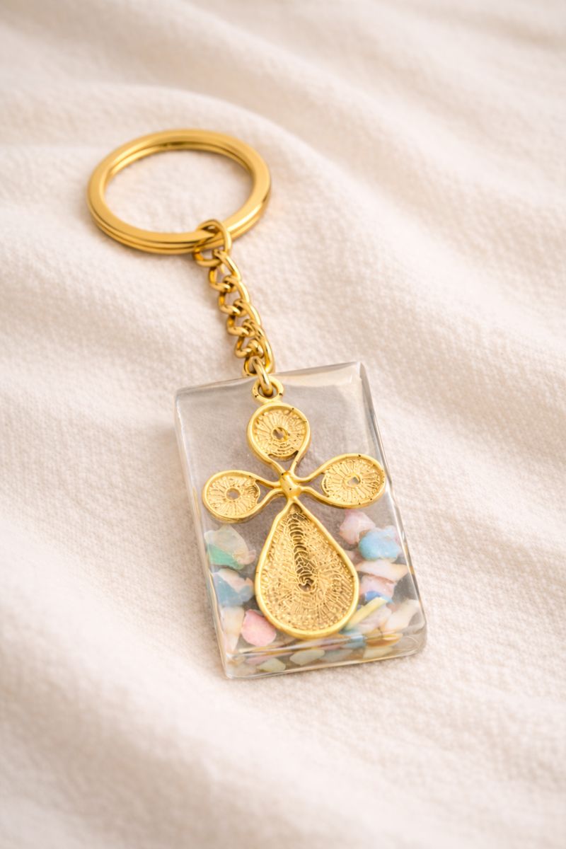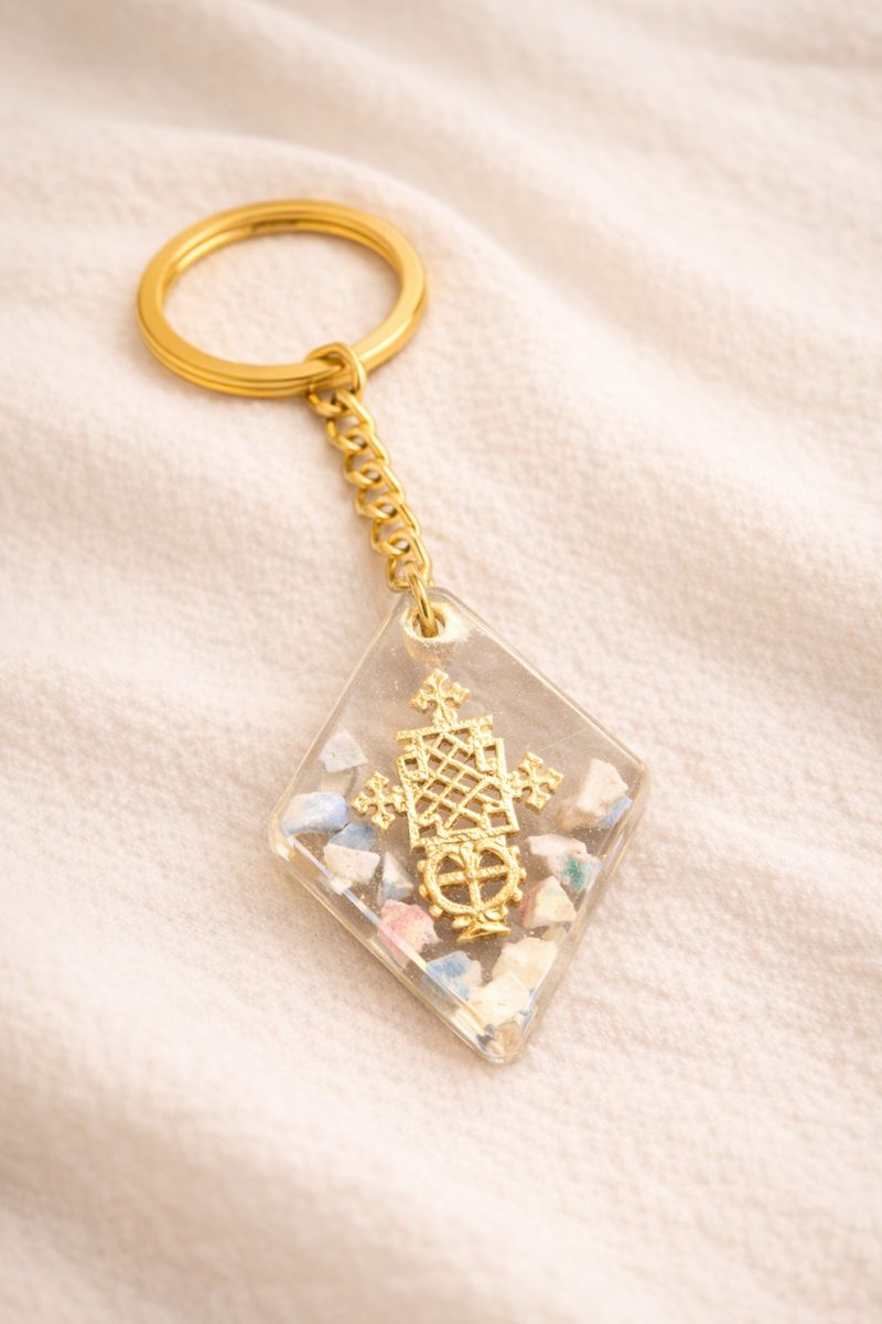The Opal x Cross Keychain is a symbolic piece crafted with Ethiopian heritage in mind. Each keychain contains authentic opal fragments, set into clear resin to showcase their natural fire — glowing flashes of blue, green, and orange reminiscent of Wollo’s volcanic opal fields.