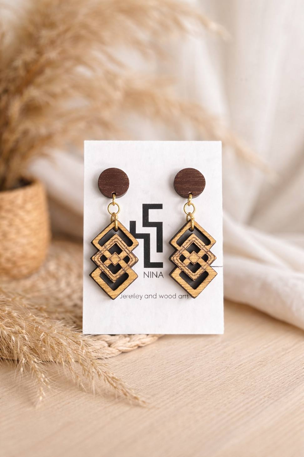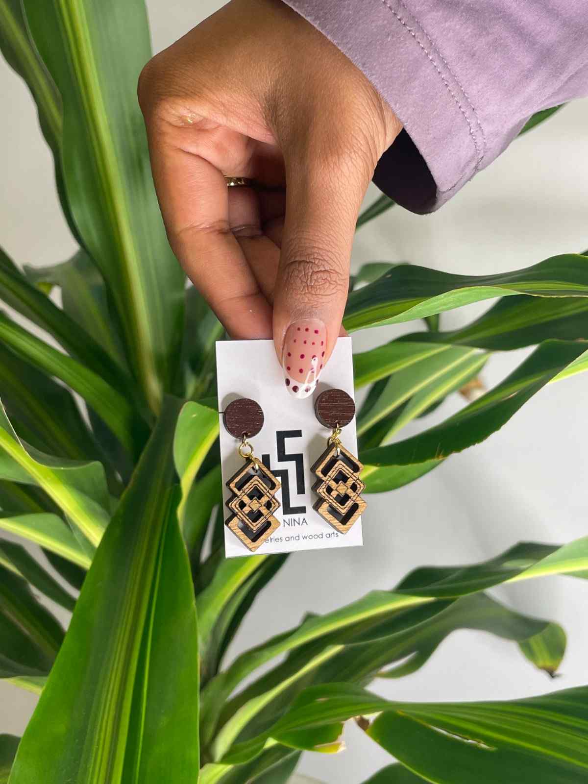 Redefine your angles. The Qemer Handmade Wooden Earrings by Nina Jewleries combine architectural precision with organic warmth. featuring a stunning 3D stacked diamond design. Lightweight and exclusively at Afrikart.