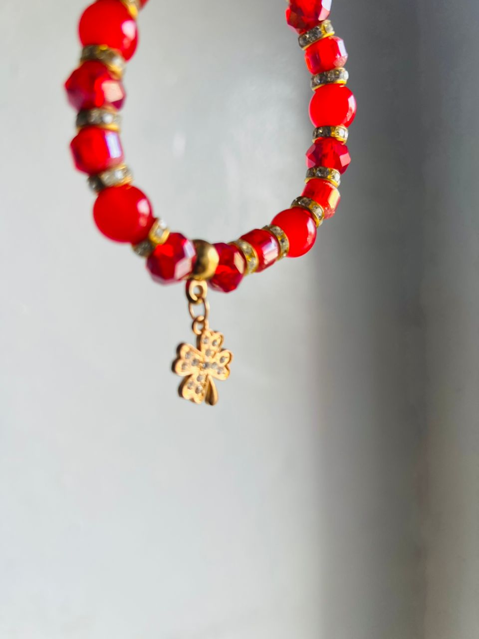 The beauty of this piece lies in the rhythm of its beads. Artisans alternate the large, faceted red crystals with intricate rhinestone-studded spacer rings. This spacing prevents the beads from rubbing against each other and amplifies the overall shine of the bracelet. The focal point—the gold clover—is securely attached with a sturdy jump ring, ensuring it dangles freely to catch the light from every angle.