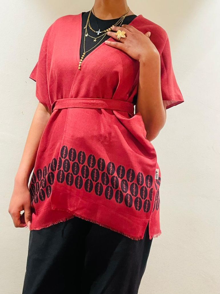 The Royal Burgundy Cardigan is a celebration of color and culture. The fabric is crafted with patience, resulting in a texture that is soft to the touch and drapes beautifully. The intense wine-red hue transforms the delicate "SIS" weave into a statement piece, perfect for those who want to add depth to their ensemble without the heaviness of wool. Its inviting color palette reflects the vibrancy of African artistry, while the decorative motifs serve as a subtle nod to the rich textile traditions of the Horn of Africa.