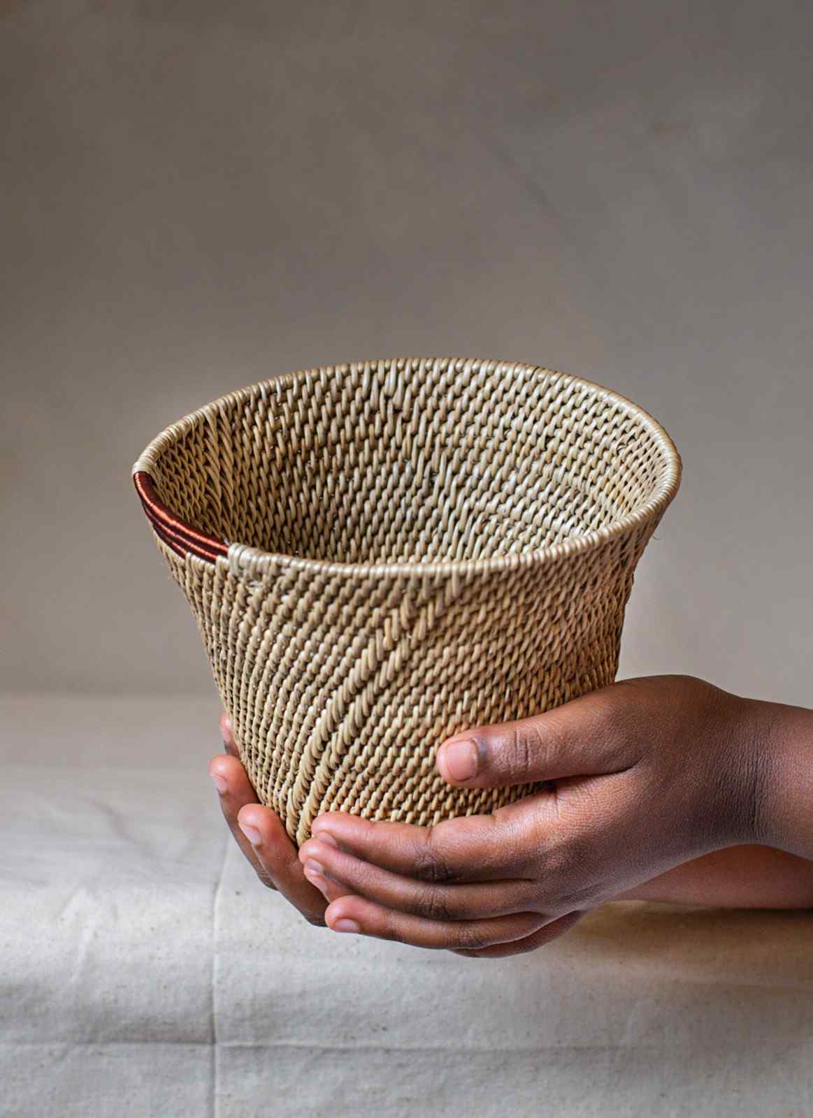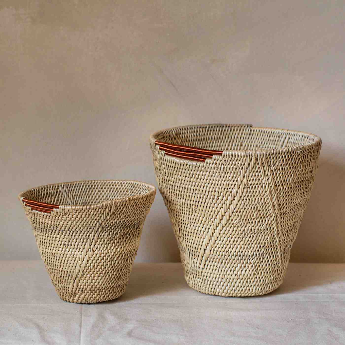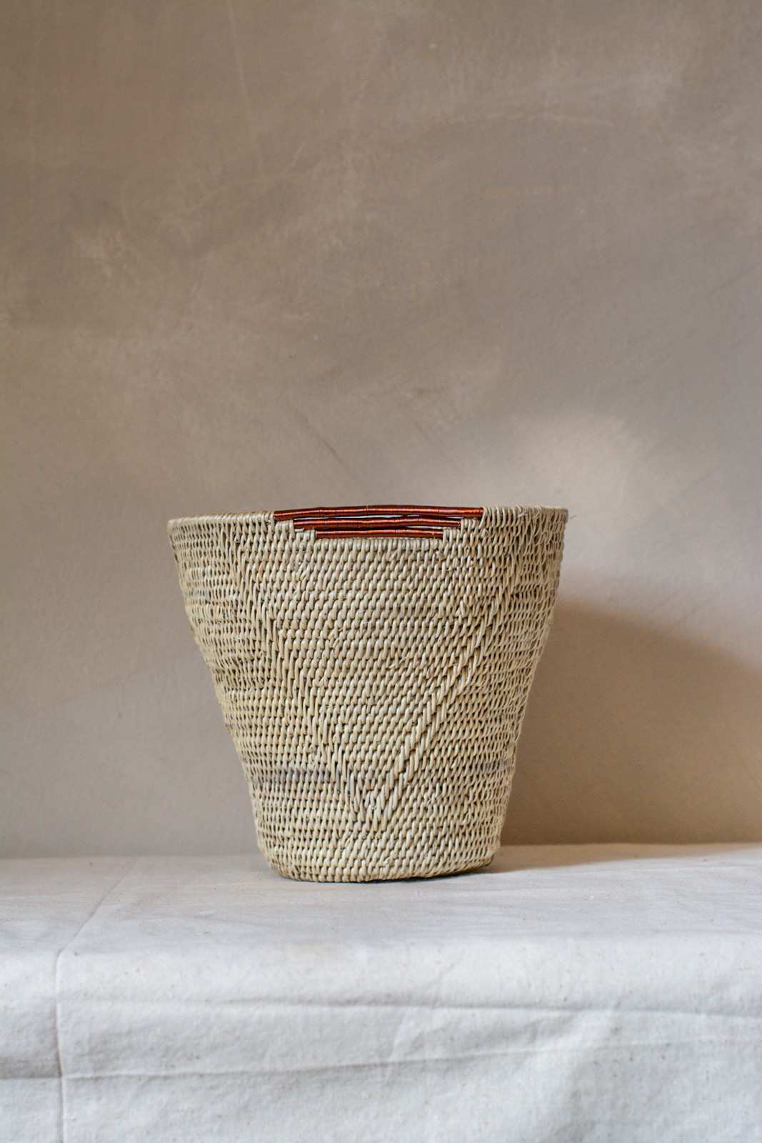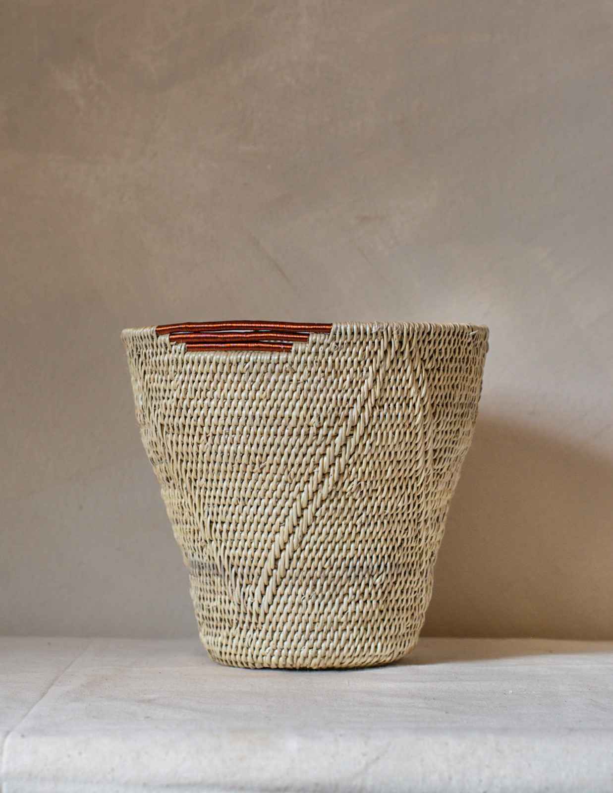 Shop: Saucy MukosaThe Ntambi Range | Sculptural Makenge Baskets with Copper Detailing | Handwoven Zambian Art | Tapered Basket or Low Bowl | Makenge Root basket | Handwoven Zambian basket |African artisan baskets | One-of-a-kind home decor | Functional woven vessels | Slow craft baskets | Lozi Mbunda weaving | Saucy Mukosa artisan baskets