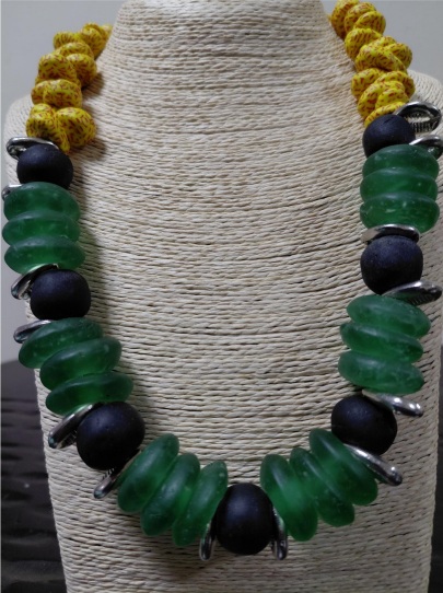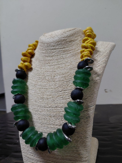 Tide And Terra Necklace | Silver Plated Cowrie Jewelry | Recycled Glass Necklace | Artisan Clay Accessory | Green Black Yellow Jewelry | African Symbolism Necklace | Sustainable Statement Piece | Handcrafted Large Necklace