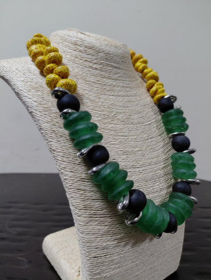 • Natural Hand-Molded Clay, Recycled Glass (from bottles), Silver-Plated Cowrie Shells, Durable Fiber Cord.