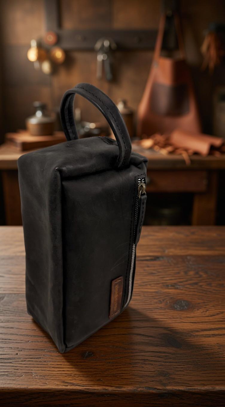 Featuring a sleek black leather exterior and a robust zipper closure, this dopp kit offers a sensory experience of premium quality. The practical side handle and leak-resistant interior ensure it perfectly accommodates your dynamic lifestyle, blending rugged African craftsmanship with modern travel necessity.