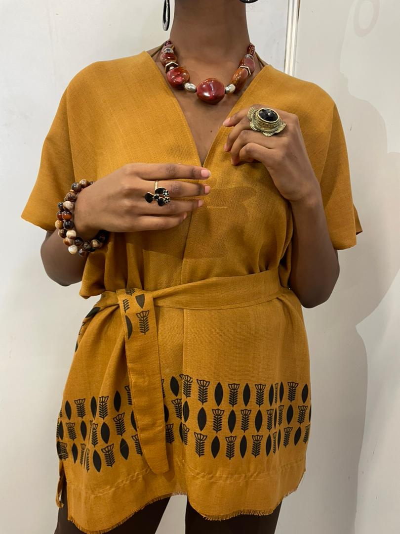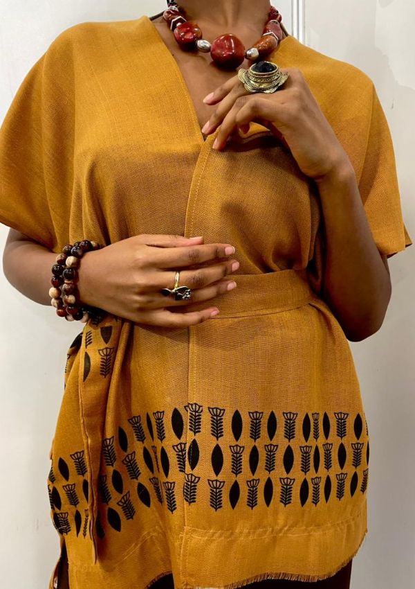 The Warm Bronze Cardigan ( SIS ) captures the earthy beauty of the Ethiopian highlands. Unlike mass-produced synthetic knits, this piece breathes and moves with you. The deep golden-bronze color is inviting and warm, serving as the perfect backdrop for the bold black geometric-botanical patterns stamped along the border. These motifs, reminiscent of stylized grain or leaves, provide a sharp, elegant contrast that modernizes the traditional look. Whether worn over a swimsuit or paired with tailored trousers, it bridges the gap between ancient tradition and contemporary style.