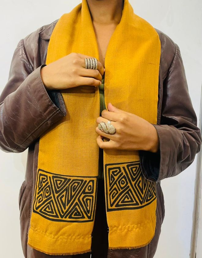 The Bronze Scarf ( SIS ) captures the essence of modern African design. The rich mustard-bronze tone brings a glow to neutral outfits, while the black tribal block print adds a layer of sophistication and graphic interest. The geometric spirals and lines pay homage to traditional African motifs but are executed with a clean, contemporary look. Whether paired with a leather jacket or a simple white tee, it serves as an artistic focal point that bridges the gap between heritage and modern style.