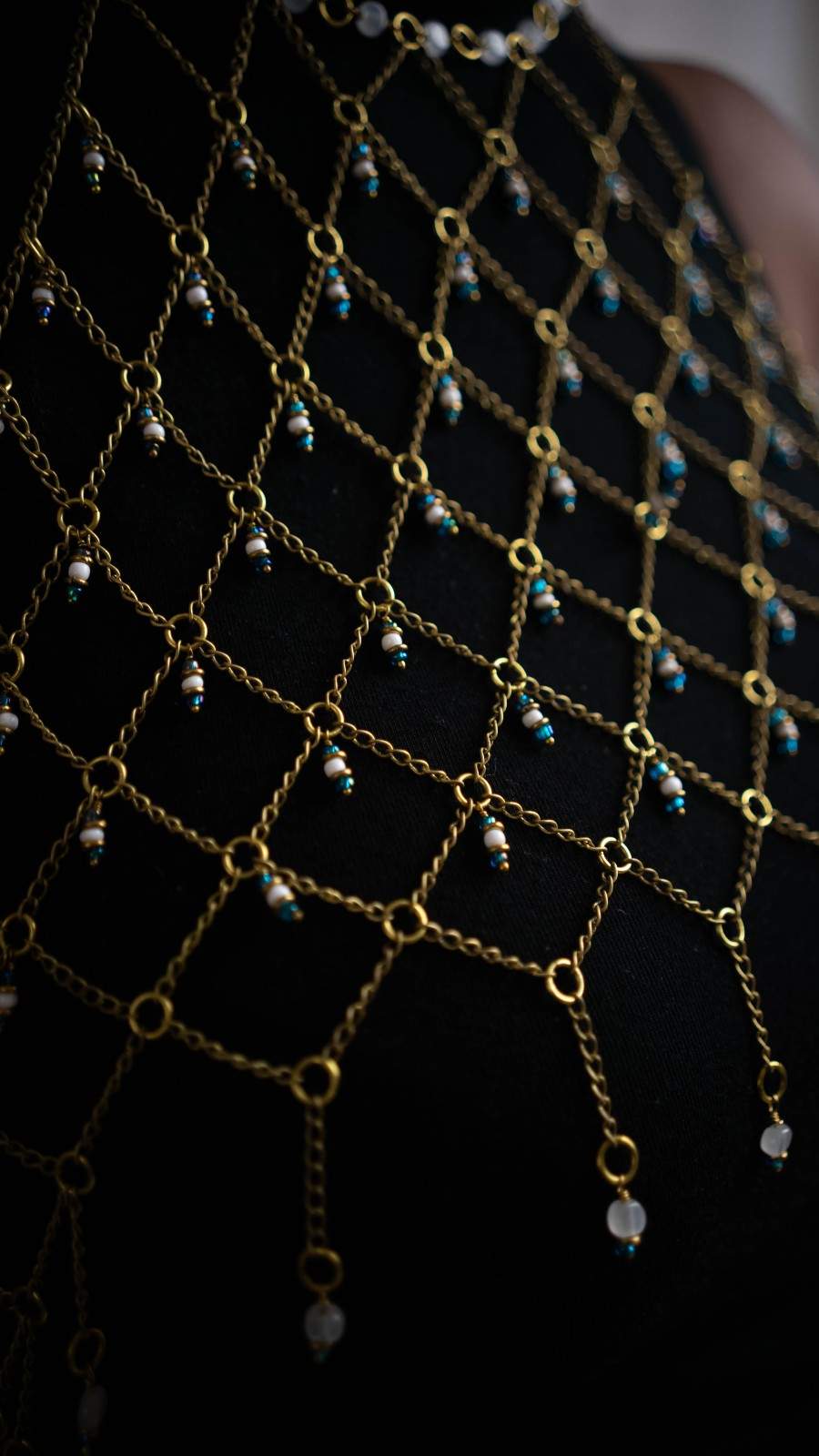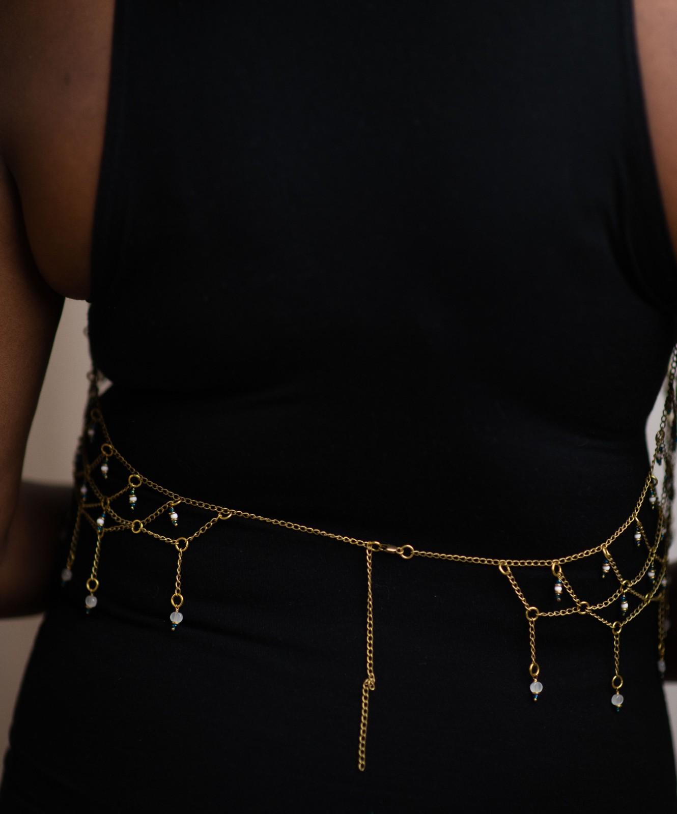 Meticulously handcrafted by skilled artisans, this body chain is a masterpiece of wearable architecture. It is woven from gleaming glass beads and solid brass components to create a flexible, mesh-like fabric that drapes flawlessly over the body.