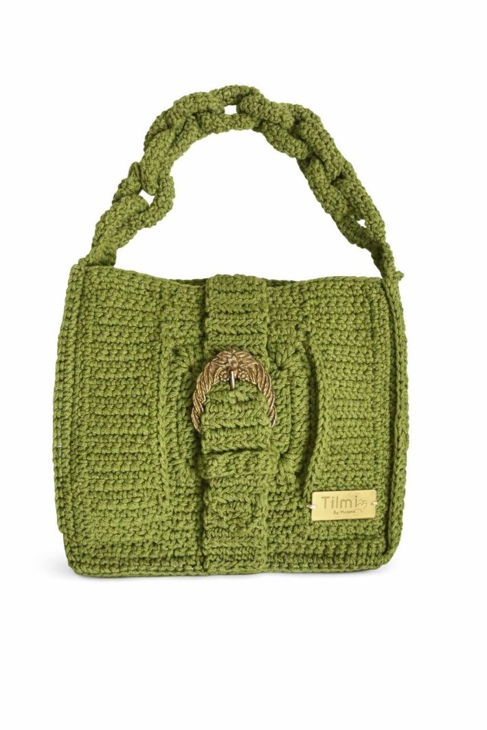 Shop: Tilmi by MoanaHandmade Crochet Shoulder Bag | Olive Green Macramé Cotton | Antique Gold Turn-Lock | Secure Magnetic Closure | Everyday Casual Wear | Thick Woven Strap | Handcrafted Artisanal Bag | Medium Capacity