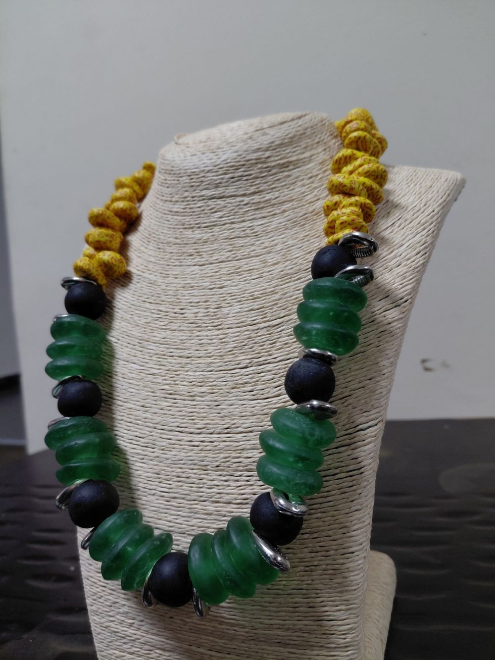 Shop: Indigene DesignTide And Terra Necklace | Silver Plated Cowrie Jewelry | Recycled Glass Necklace | Artisan Clay Accessory | Green Black Yellow Jewelry | African Symbolism Necklace | Sustainable Statement Piece | Handcrafted Large Necklace