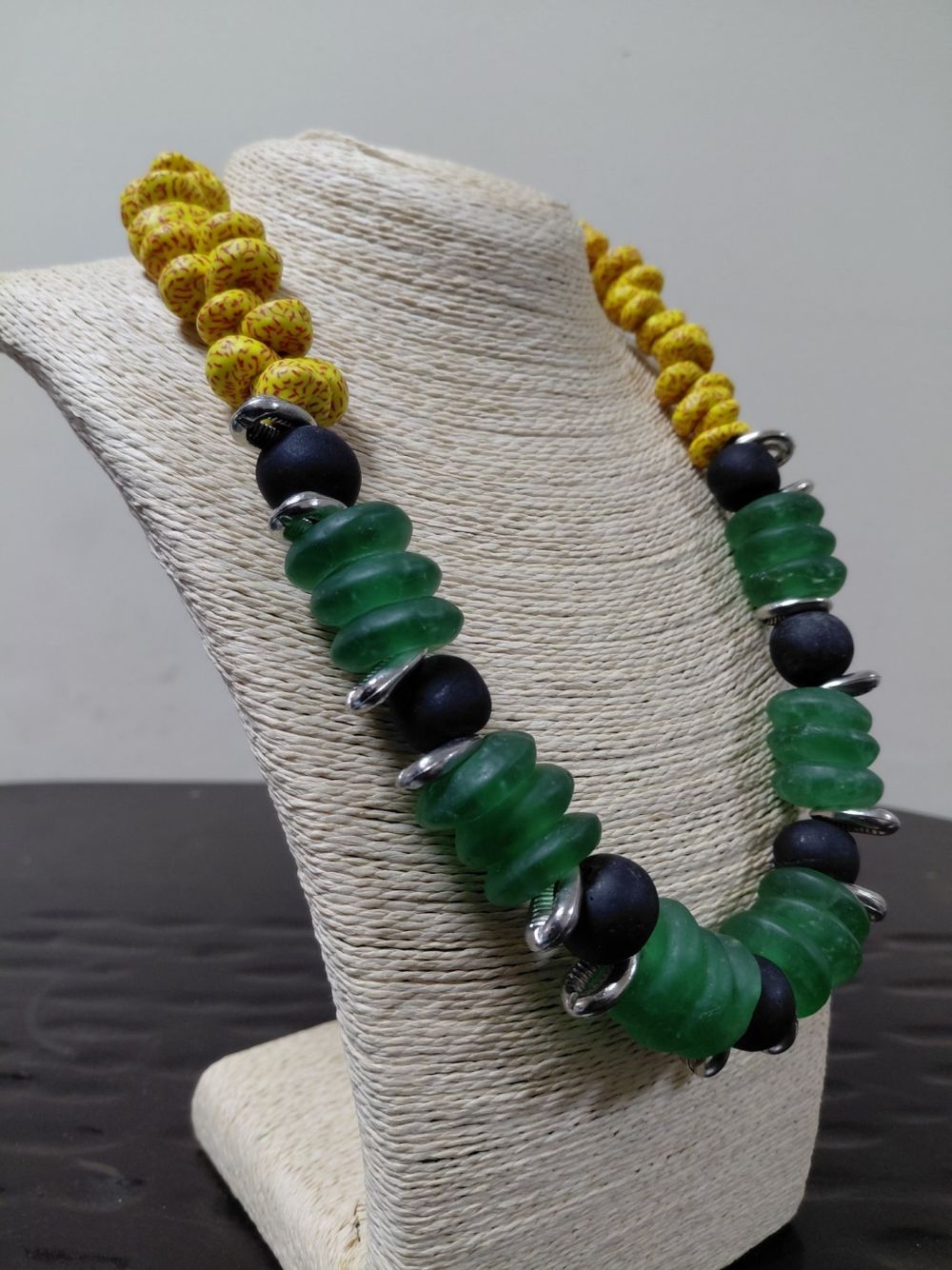 Upcycled Glass Fluidity: Vibrant green and yellow recycled glass beads mimic the "Tide," catching light to represent the clarity and movement of water.